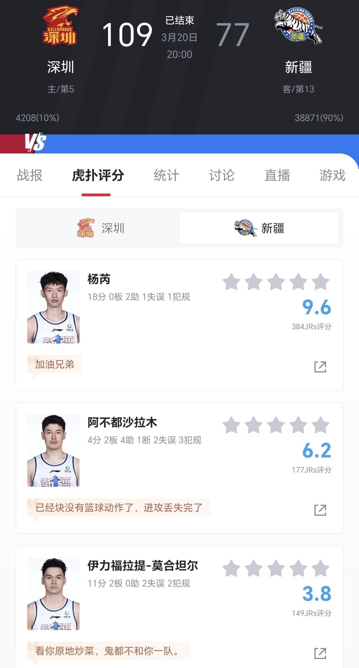 看了今晚新疆男篮与深圳男篮的比赛,我真的很高兴呀!新疆男篮只不过才输了32分而已。如果深圳的李慕豪不装死,如果深圳不那么强,还没有主场哨,如果王浩然一打新疆就不爆发,如果格兰在第二节变招,上双大外,却不交待明白,让劳森做个组织中锋,给门内加传球的话,我敢保证,这场比赛即便是深圳能赢,也最多大胜一、两分的。 都怪深圳男篮那么凶,又那么快,那么准,又那么狠!一点不讲武德,可没有见过你们对别的队这样的呀!你们对新疆队是真敢下死手呀!要是新疆队的NBA球员哈里斯还在的话,一定打得你们满地找牙!