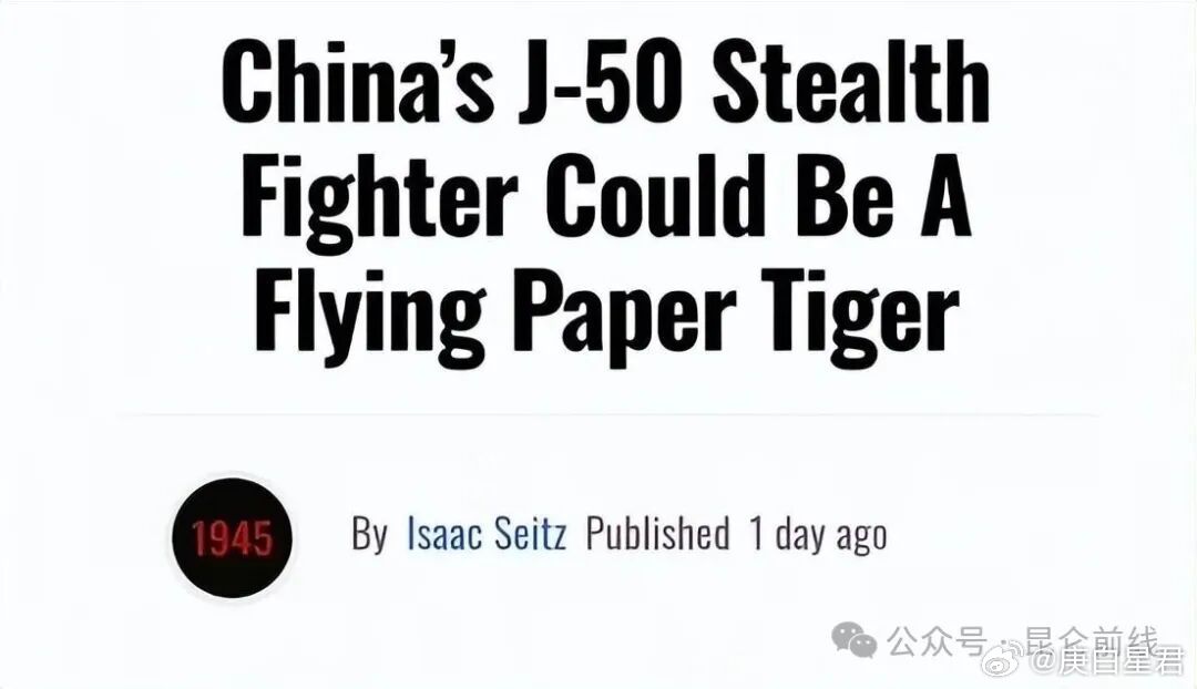 近日,美国1945军事网站在报道中国六代机歼-50的时候,将其称为“纸老虎”,标题原文是:china's J-50 stealth fighter coule be A flying paper tiger(中国歼-50隐形战斗机可能是一只会飞的纸老虎)。