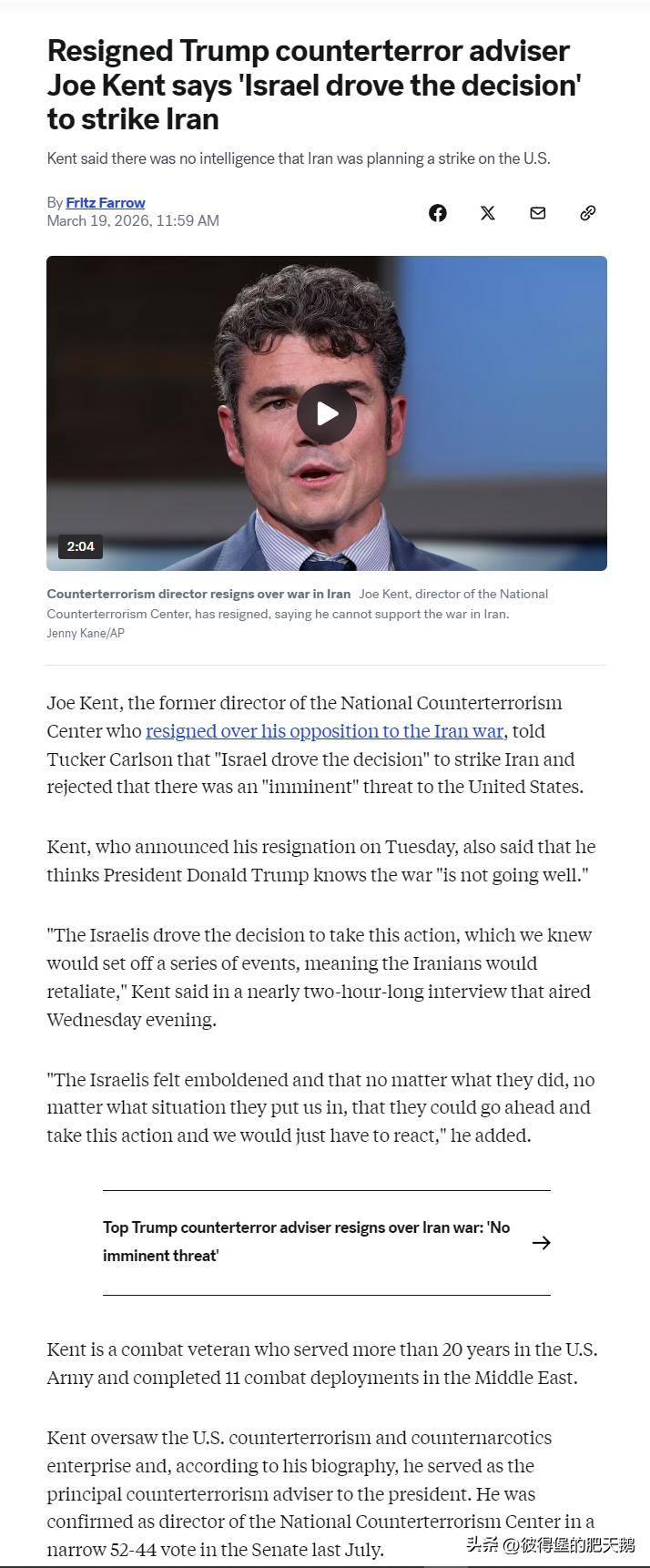 辞职的特朗普反恐顾问乔。肯特称'以色列推动了对伊朗发动袭击的决定。 肯特表示,没有情报表明伊朗计划对美国发动的。 乔·肯特曾是美国国家反恐中心的前主任,因对伊朗战争持反对立场而选择辞职。他向塔克·卡尔森表示,"以色列推动了打击伊朗的决定"。他否认存在针对美国的"迫在眉睫"的威胁。 肯特在本周二宣布辞职,他还表示,他认为唐纳德·特朗普总统知道这场战争“进展不顺”。 肯特周三晚上在近两个小时的采访中表示:“以色列推动了这一决定,我们知道这将引发一系列事件,意味着伊朗会进行报复。” "以色列人感到被激怒,他们认为无论我们处于何种境地,只要采取行动,我们就只能做出反应,"他补充道 特朗普反恐顾问因伊朗战争辞职:'无迫在眉睫的威胁 肯特是一名战斗老兵,曾在美军服役超过20年,并在中东完成了11次战斗部署。 肯特曾负责领导美国的反恐和禁毒行动。根据他的个人传记,他曾担任总统的主要反恐顾问。去年7月,他在参议院以52票对44票的微弱优势获得确认,成为国家反恐中心主任一职的任职者。