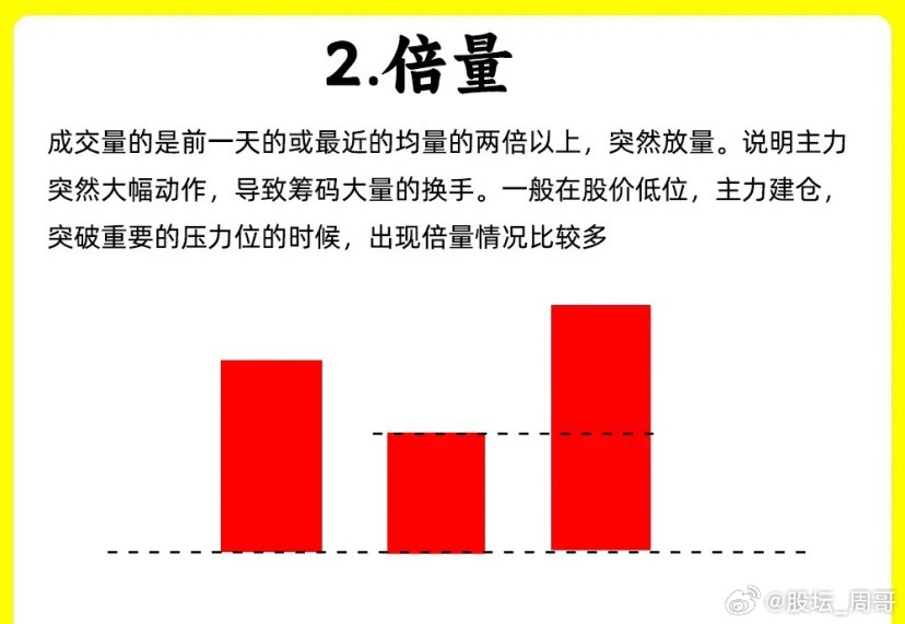 就是当天成交量量柱是昨天的一倍以上,出现成交量放大。如果是股价上涨,成交量倍量,说明多方开始发力,如果是股价下跌过程里,出现倍量阴线,你那说明抛压很大。所以倍量一般出现的位置是会在突破或跌破重要位置出现。