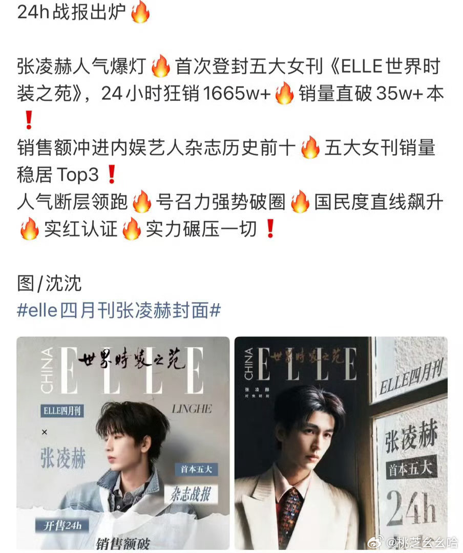 张凌赫杂志冲进内娱前十张凌赫首登封五大女刊《ELLE世界时装之苑》,24小时狂销1665w+,销量直破35w+本,销售额冲进内娱艺人杂志历史前十!脸就是最好的证明