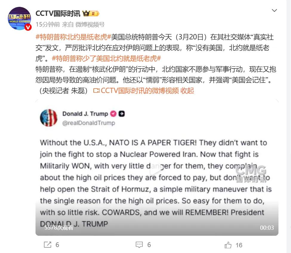 3月21日,据美国媒体报道,昨天,美国总统特朗普发文称,没有美国支持,北约就是一个纸老虎。 美国与北约国家走到了十字路口,应该分道扬镳了![呲牙][呲牙][呲牙][呲牙][呲牙][呲牙][呲牙][呲牙][呲牙]
