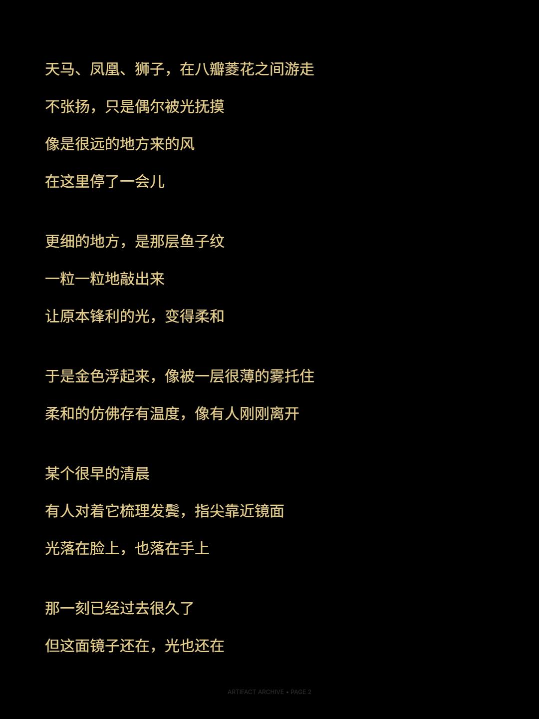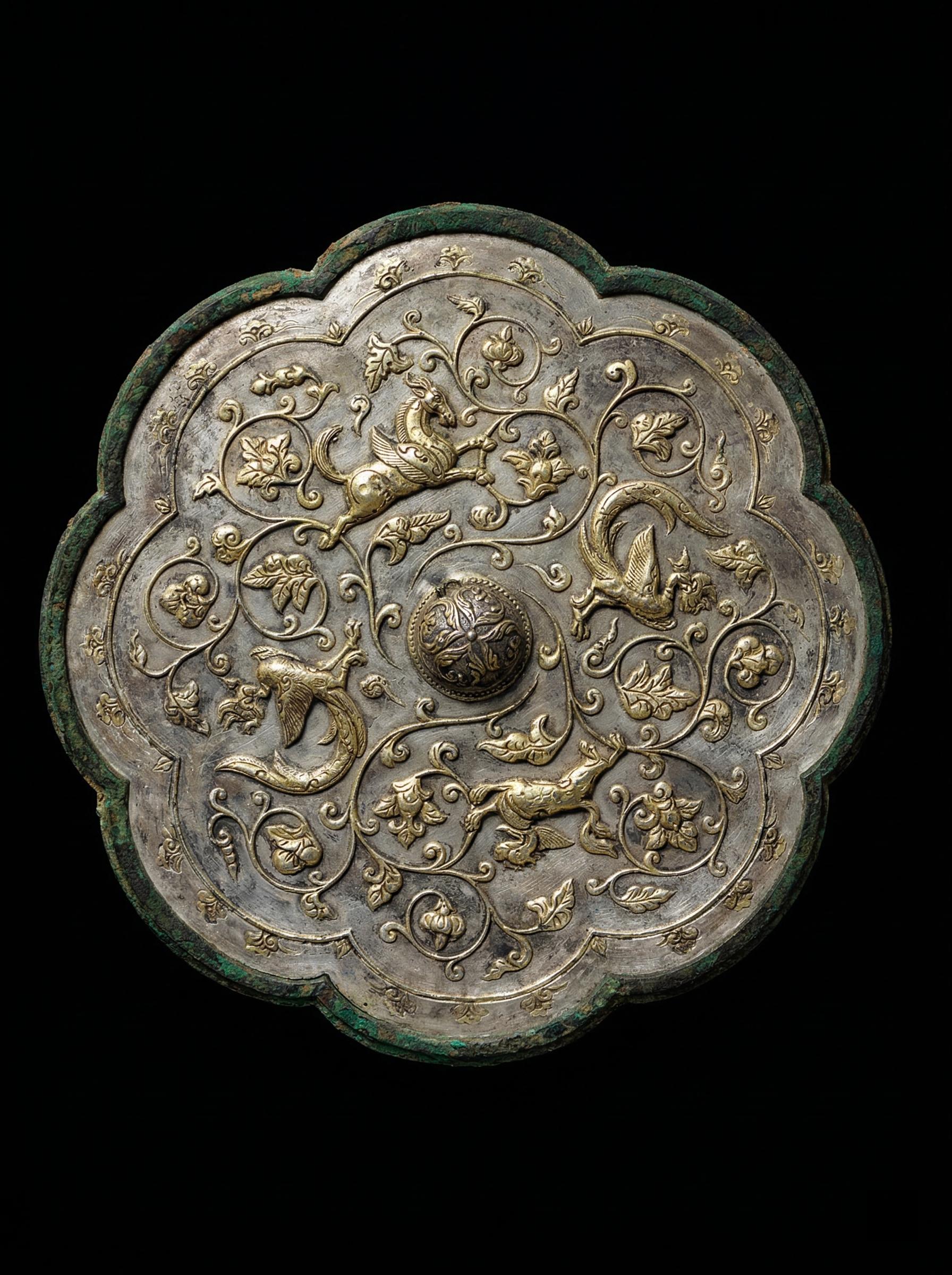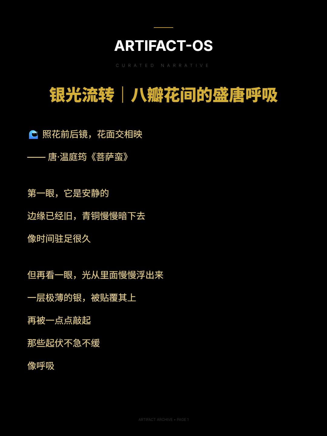 银光流转|八瓣花间的盛唐呼吸。🌊 照花前后镜,花面交相映 —— 唐·温庭筠《菩萨蛮》 第一眼,它是安静的 边缘已经旧,青铜慢慢暗下去 像时间驻足很久 但再看一眼 光从里面慢慢浮出来 一层极薄的银,被贴覆其上 再被一点点敲起 那些起伏不急不缓 像呼吸 天马、凤凰、狮子 在八瓣菱花之间游走 不张扬 只是偶尔被光抚摸 像是很远的地方来的风 在这里停了一会儿 更细的地方,是那层鱼子纹 一粒一粒地敲出来 让原本锋利的光,变得柔和 于是金色浮起来 像被一层很薄的雾托住 柔和的仿佛存有温度 像有人刚