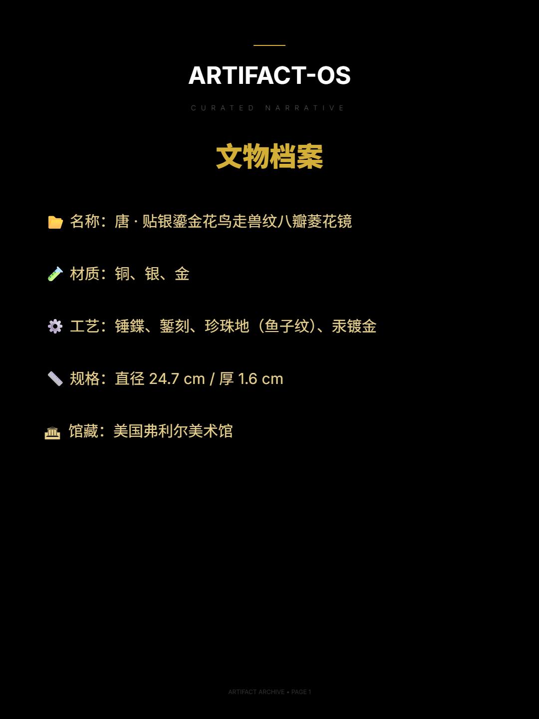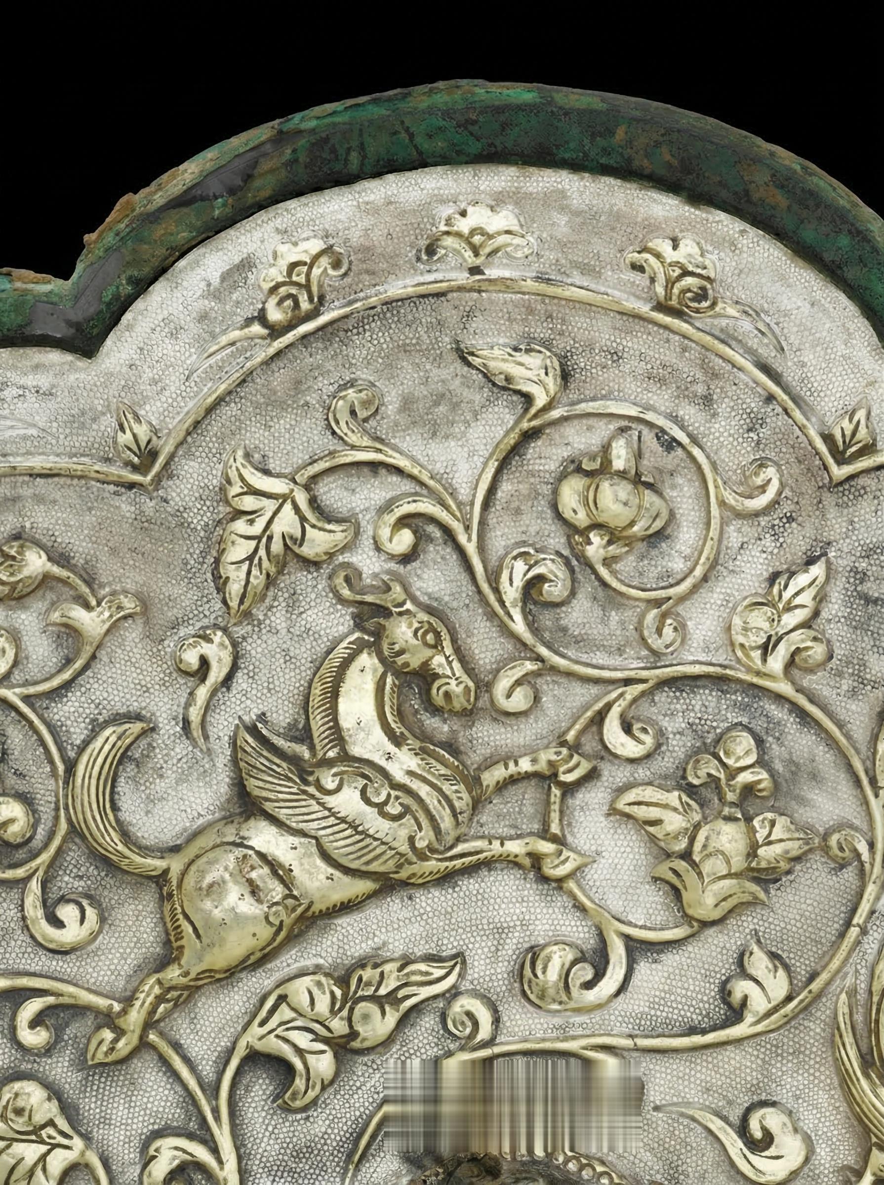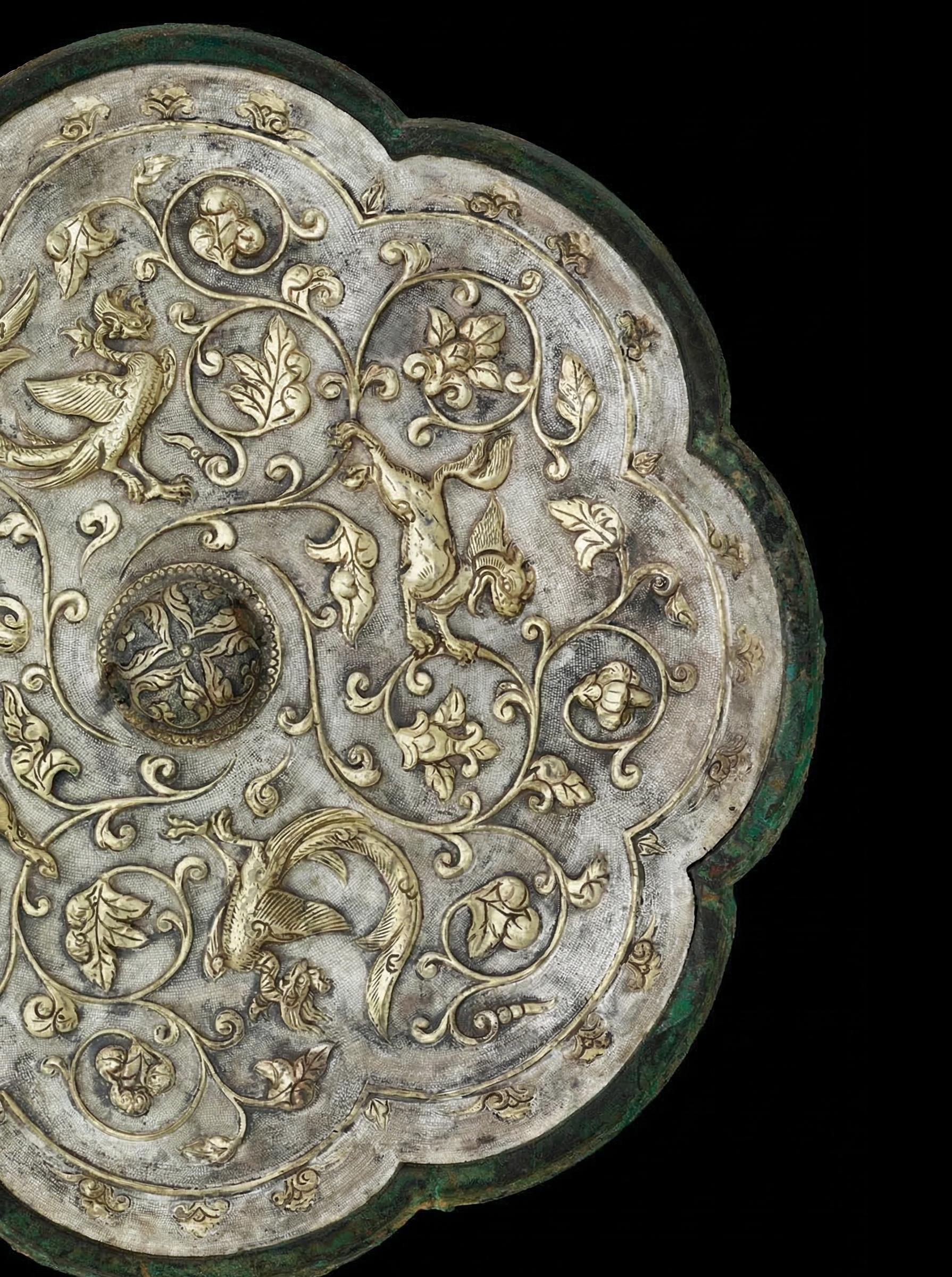 银光流转|八瓣花间的盛唐呼吸。🌊 照花前后镜,花面交相映 —— 唐·温庭筠《菩萨蛮》 第一眼,它是安静的 边缘已经旧,青铜慢慢暗下去 像时间驻足很久 但再看一眼 光从里面慢慢浮出来 一层极薄的银,被贴覆其上 再被一点点敲起 那些起伏不急不缓 像呼吸 天马、凤凰、狮子 在八瓣菱花之间游走 不张扬 只是偶尔被光抚摸 像是很远的地方来的风 在这里停了一会儿 更细的地方,是那层鱼子纹 一粒一粒地敲出来 让原本锋利的光,变得柔和 于是金色浮起来 像被一层很薄的雾托住 柔和的仿佛存有温度 像有人刚