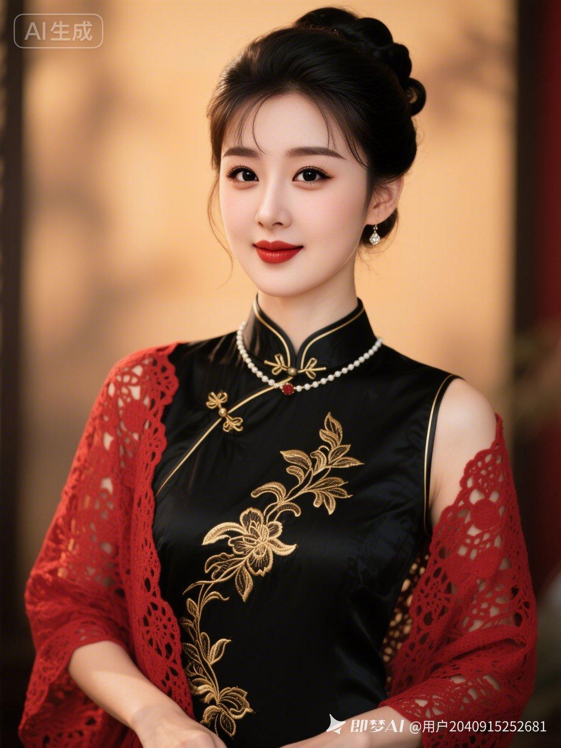 气质美女身着黑色金线刺绣新中式旗袍,搭配中国红镂空披肩,温婉盘发,颈间项链点缀。浅笑高雅,尽显东方韵味,画质细腻精致。