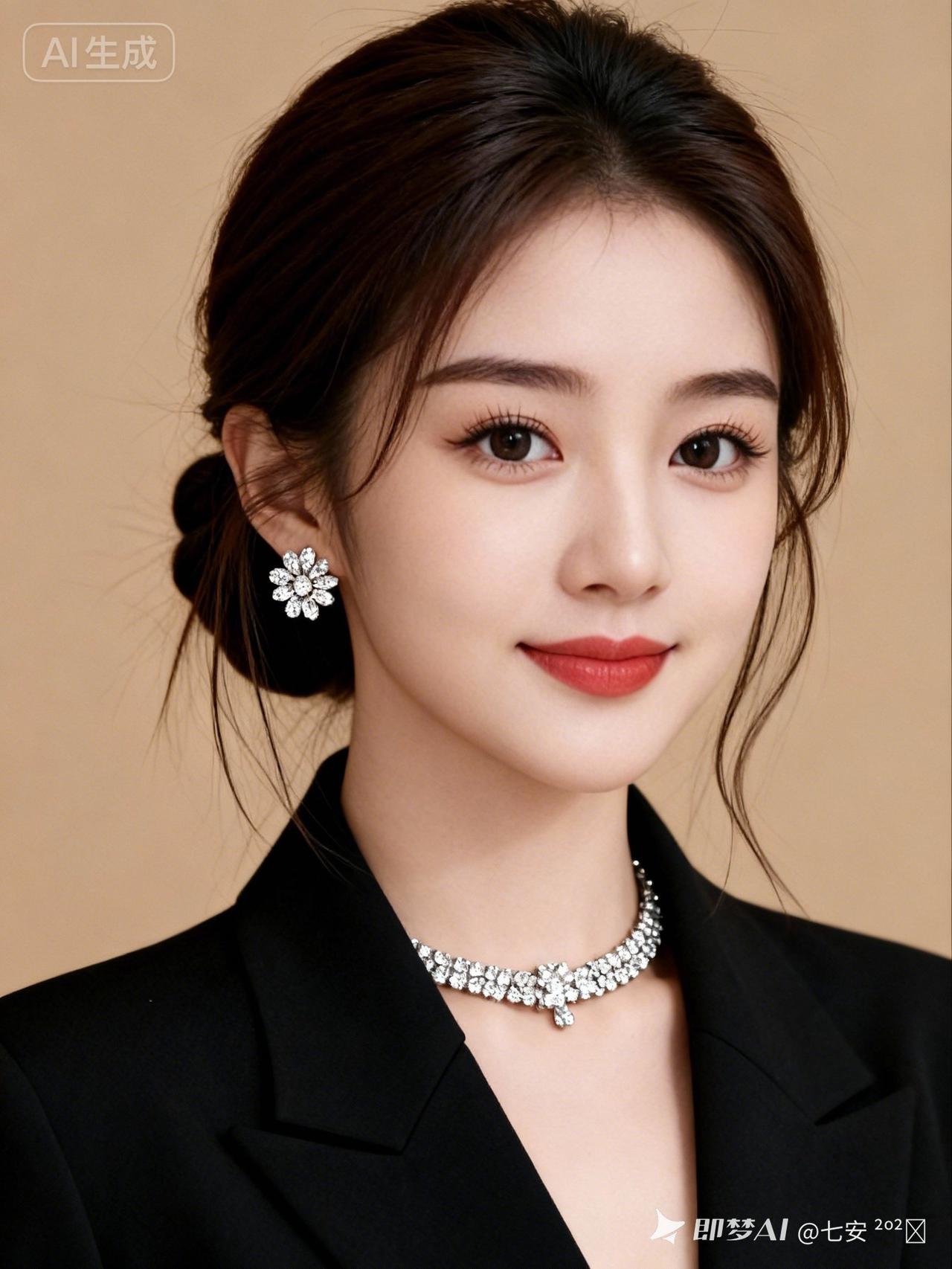 深棕发丝低盘成髻,碎发自然垂落,镶钻花朵耳钉搭配满钻短项链,精致闪耀。身着简约黑西装,纯白背景衬柔和光线,整体干练精致,尽显优雅气质。