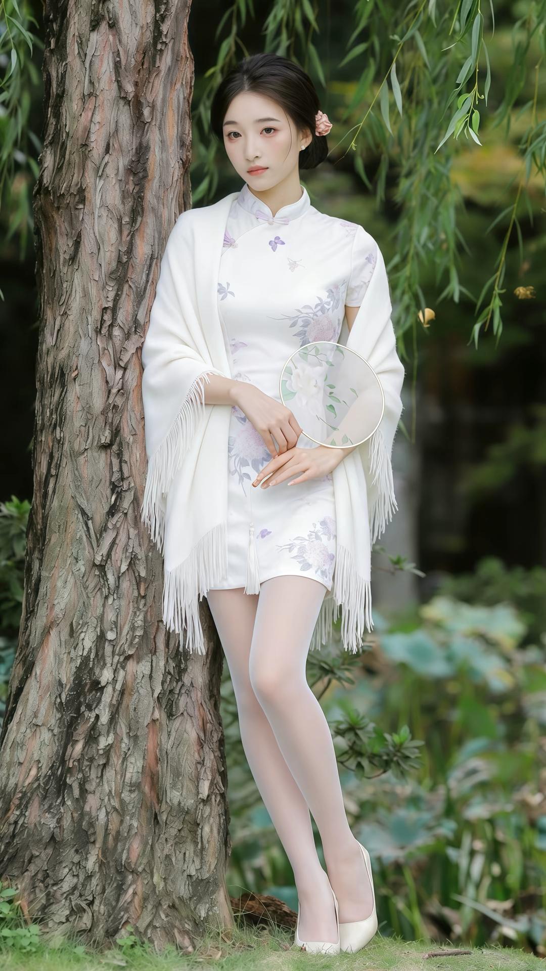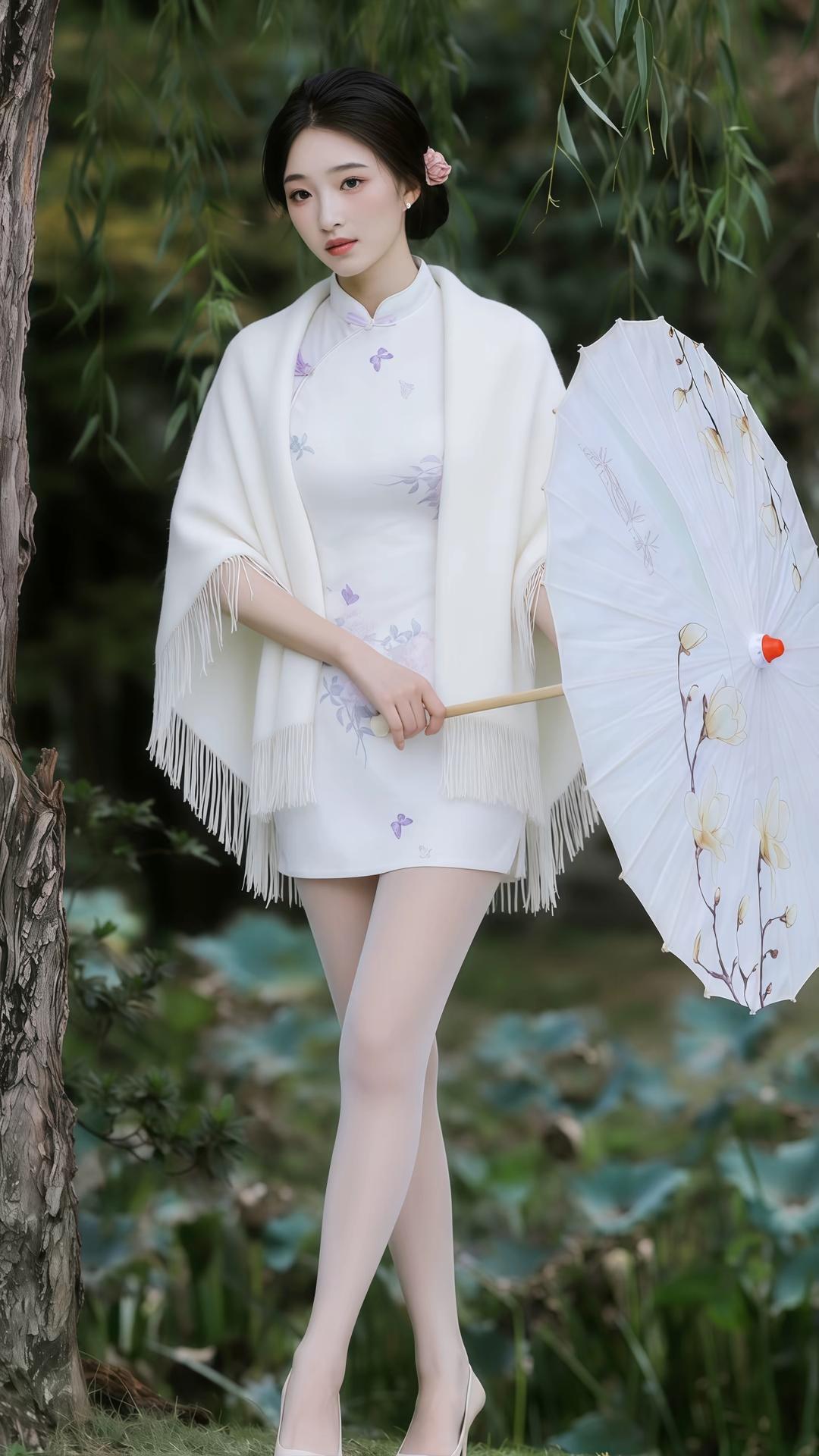 她身着一袭米白色改良短款旗袍,衣身绣着淡雅的紫色绣球花与蝴蝶,清新脱俗。外搭一件同色系流苏披肩,增添了几分柔美与朦胧感。乌黑的秀发挽成低髻,鬓边别着一朵粉嫩小花,眉眼如画,红唇轻启,尽显东方女性的温婉韵味。 她手持一把绘有玉兰的油纸伞,时而轻举伞柄,时而倚树而立,身姿曼妙,亭亭玉立。背景是绿意盎然的垂柳与荷塘,朦胧的绿意衬得她肌肤胜雪,一颦一笑间,皆是岁月静好的诗意,仿佛一幅流动的江南水墨画。