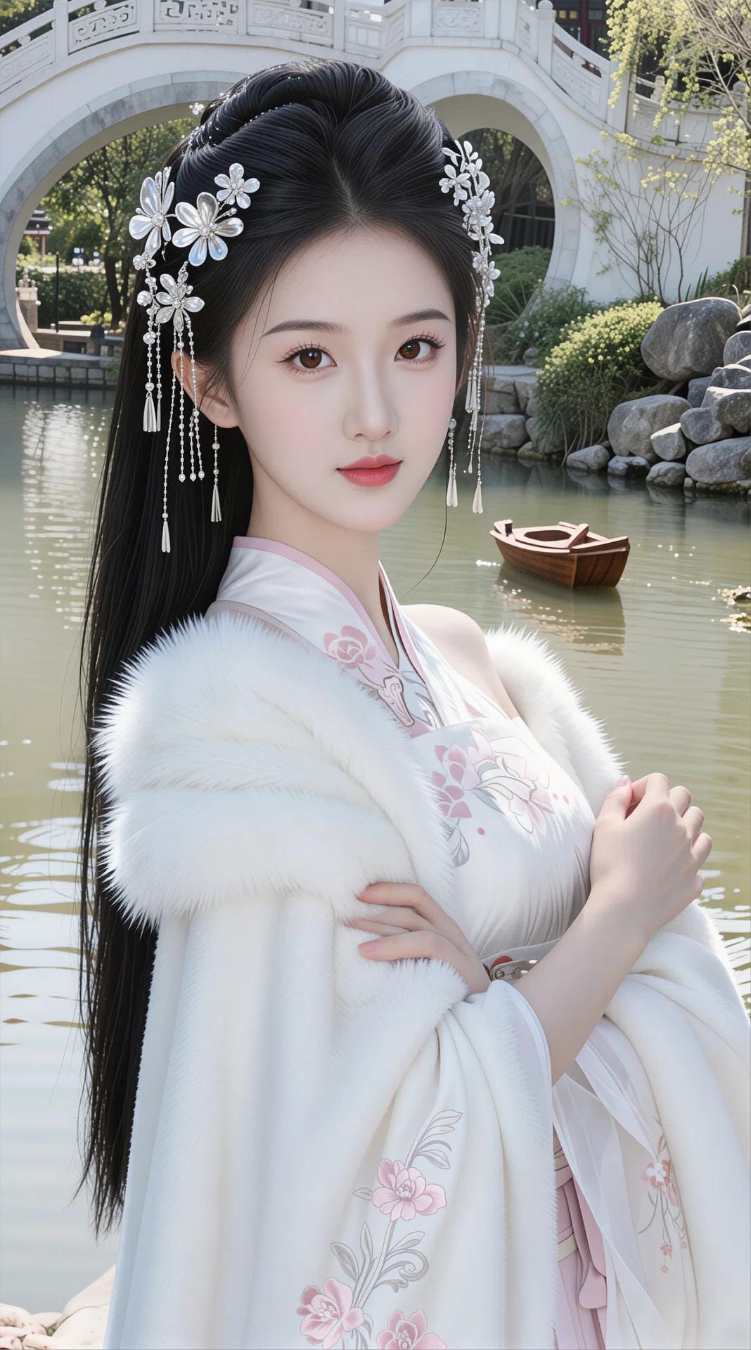 这组照片中的女子宛如从江南水墨画中走出的古风仙子,仙气飘飘,清冷又绝美。 她身着一袭纯白抹胸古风长裙,衣身绣着淡雅的粉色花枝,外搭一件蓬松柔软的白色毛领披风,尽显华贵与温柔。乌黑的长发梳成精致的高髻,点缀着银白花朵发饰与流苏步摇,行走间摇曳生姿,灵动又典雅。 背景是雅致的江南园林,白墙黛瓦、小桥流水、亭台楼阁相映成趣。她或立于池边,或漫步石径,眉眼如画,肌肤胜雪,红唇轻启,气质清冷出尘,一颦一笑间尽显东方古典韵味,仿佛不食人间烟火的画中仙。