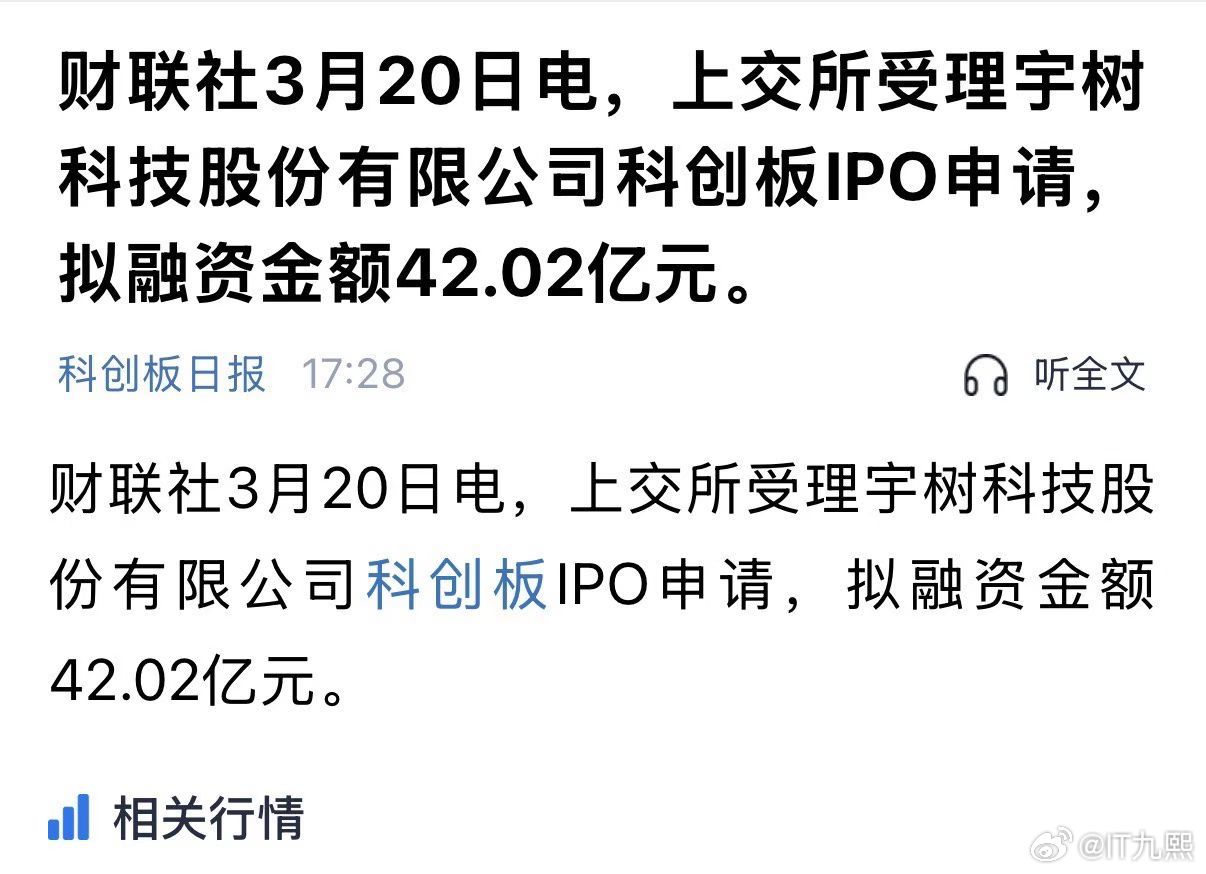 上海证券交易所正式受理宇树科技股份有限公司的科创板 IPO 申请,公司拟融资金额