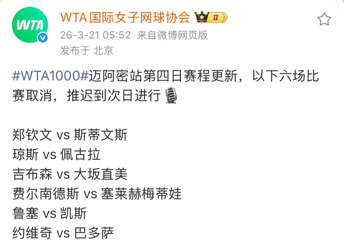 迈阿密站第二轮郑钦文与斯蒂文斯的比赛,因雨水导致赛程积压,被推迟至明日进行。