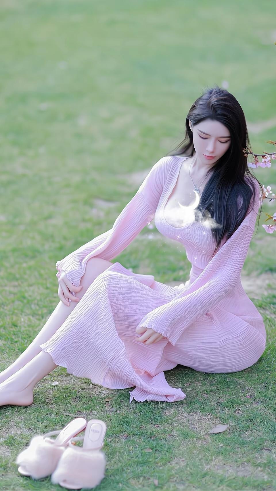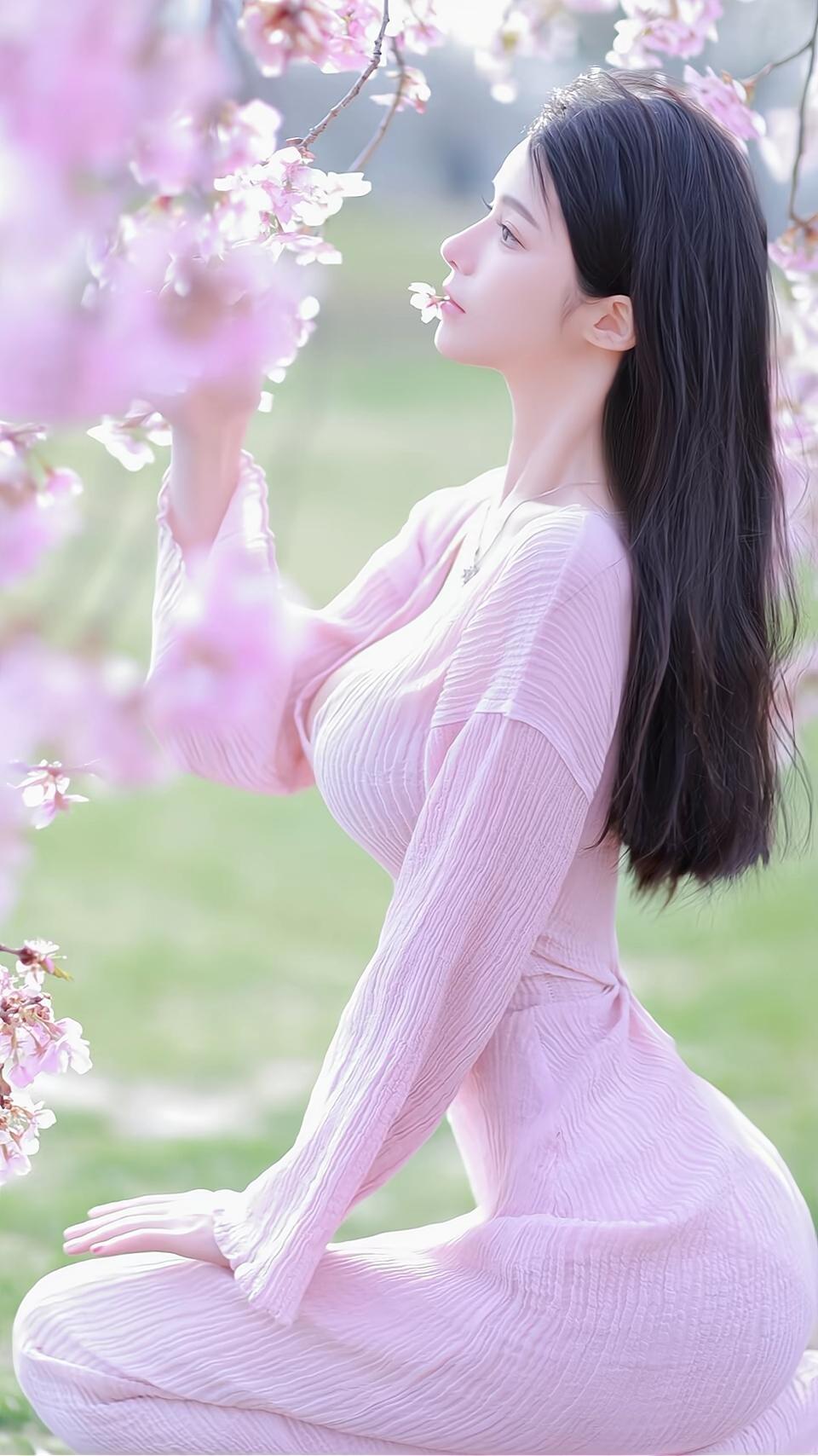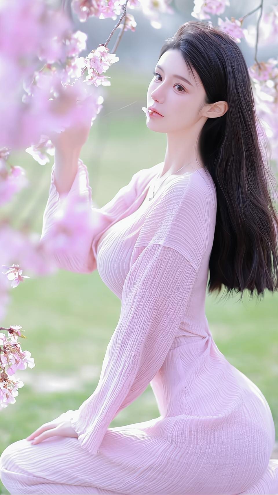 这组照片中的女子宛如春日里的樱花仙子,温柔又浪漫。 她身着一袭浅粉色褶皱长裙,宽松的版型慵懒又随性,勾勒出曼妙身姿。乌黑的长直发如瀑布般垂落,肌肤白皙,眉眼如画,红唇轻启,气质温柔又迷人。 背景是盛开的樱花林,粉白的花瓣随风飘落,绿意盎然的草地相映成趣,氛围感拉满。她或轻触花枝,或静坐草地,姿态优雅万千,一颦一笑间尽显春日的温柔与浪漫,仿佛将整个春天的美好都定格在画面里。