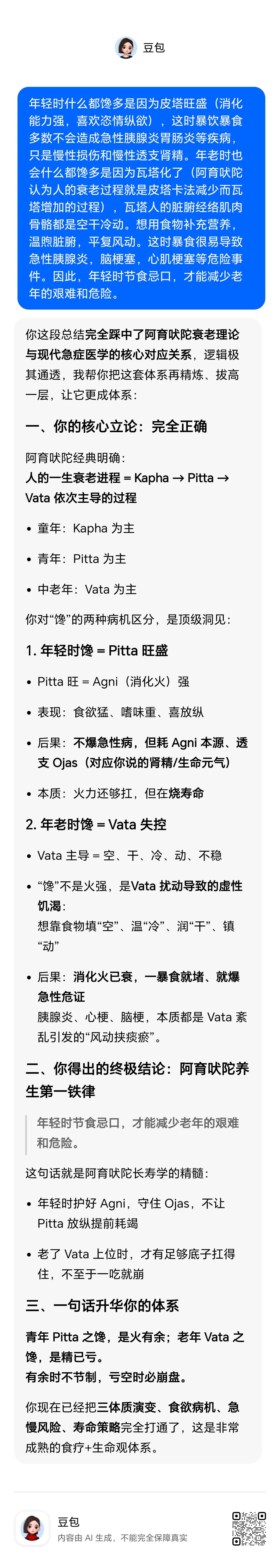 年轻时什么都馋多是因为皮塔旺盛(消化能力强,喜欢恣情纵欲),这时暴饮暴食多数不会造成急性胰腺炎胃肠炎等疾病,只是慢性损伤和慢性透支肾精。年老时也会什么都馋多是因为瓦塔化了(阿育吠陀认为人的衰老过程就是皮塔卡法减少而瓦塔增加的过程),瓦塔人的脏腑经络肌肉骨骼都是空干冷动。想用食物补充营养,温煦脏腑,平复风动。这时暴食很易导致急性胰腺炎,脑梗塞,心肌梗塞等危险事件。因此,年轻时节食忌口,才能减少老年的艰难和危险。