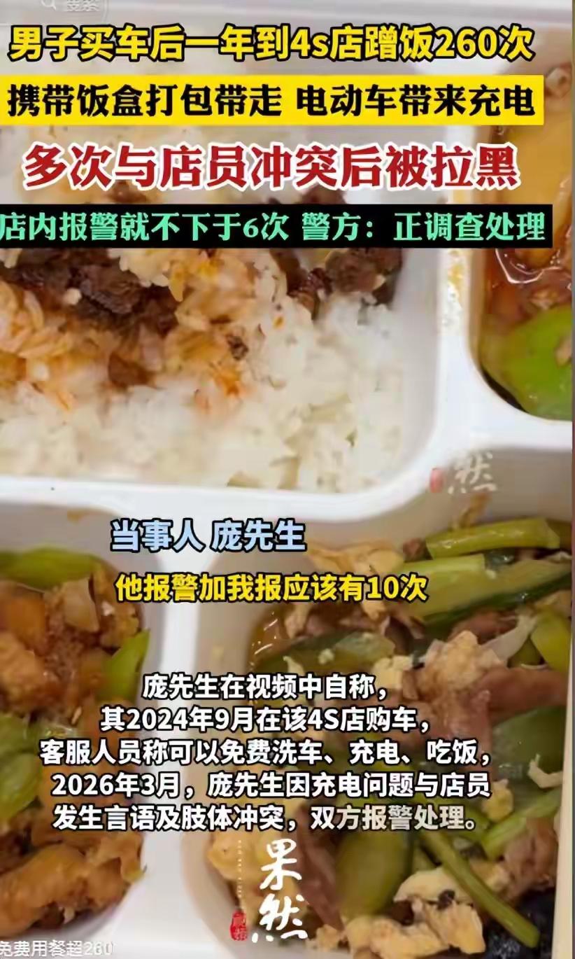 “蹭饭哥”、“薅羊毛哥”,一年365天蹭饭260次还打包,真给比亚迪车主丢脸。 见过脸皮厚的,没见过脸皮这么厚的。2024年浙江庞先生在比亚迪4s店购车,当时店里称购车后可享受免费洗车、免费充电、免费员工餐三项福利,并没有提到期限,也没有限定使用次数。 结果2025年一年,跑滴滴的庞先生天天到店里蹭饭充电,一年蹭饭次数高达260次,比员工到岗都准时,不仅吃还打包带走。不仅免费充电,还私自带自家电动自行车去店里充电,被制止后与店员发生肢体冲突,光报警就有6次。 我也是比亚迪车主,觉得他真给我们丢脸,为了支持比亚迪,我打算这个周末也去4s店蹭一顿饭,去看看这员工餐有多好吃,值当的天天去![捂脸] 记录我的2026