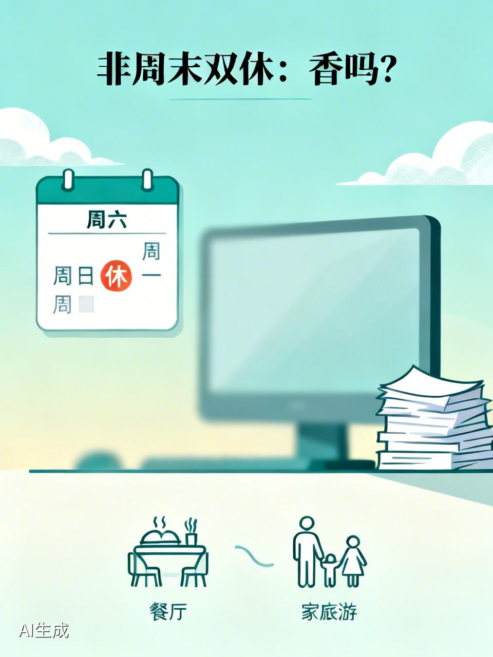 双休但不是休周末的工作,到底香不香? 现在很多人找工作都盯着双休,可有一种双休特别扎心:能休两天,但偏偏不是周末。 别人周六周日逛街聚会、陪家人孩子,你在上班;等大家都开工了,你却在家休息,看似轻松,实则处处别扭。 这种工作大多集中在教培、餐饮、医护、线下服务等行业。公司说得好听:我们也是双休,不加班。可真休起来,才知道有多无奈。朋友约饭你上班,家人出游你缺席,连办个业务都要请假,社交圈直接和大众脱节。 但转折点也很现实:对一部分人来说,这反而更香。不用挤早高峰,不用抢周末景点,错峰出行、办事不用排队,人少清净,还能避开各种消费高峰。 尤其是没家庭牵绊、不爱热闹的人,工作日休息简直是独享清净,工资不少拿,休息也没少,性价比一下就上来了。 说到底,没有完美的工作,只有适合自己的生活。 有人受不了和家人朋友作息错位,觉得孤单又憋屈;也有人乐得避开人潮,自在又舒服。 能接受错峰双休,还是必须死守周末?其实全看自己的生活状态。适合自己的节奏,才是最好的工作。