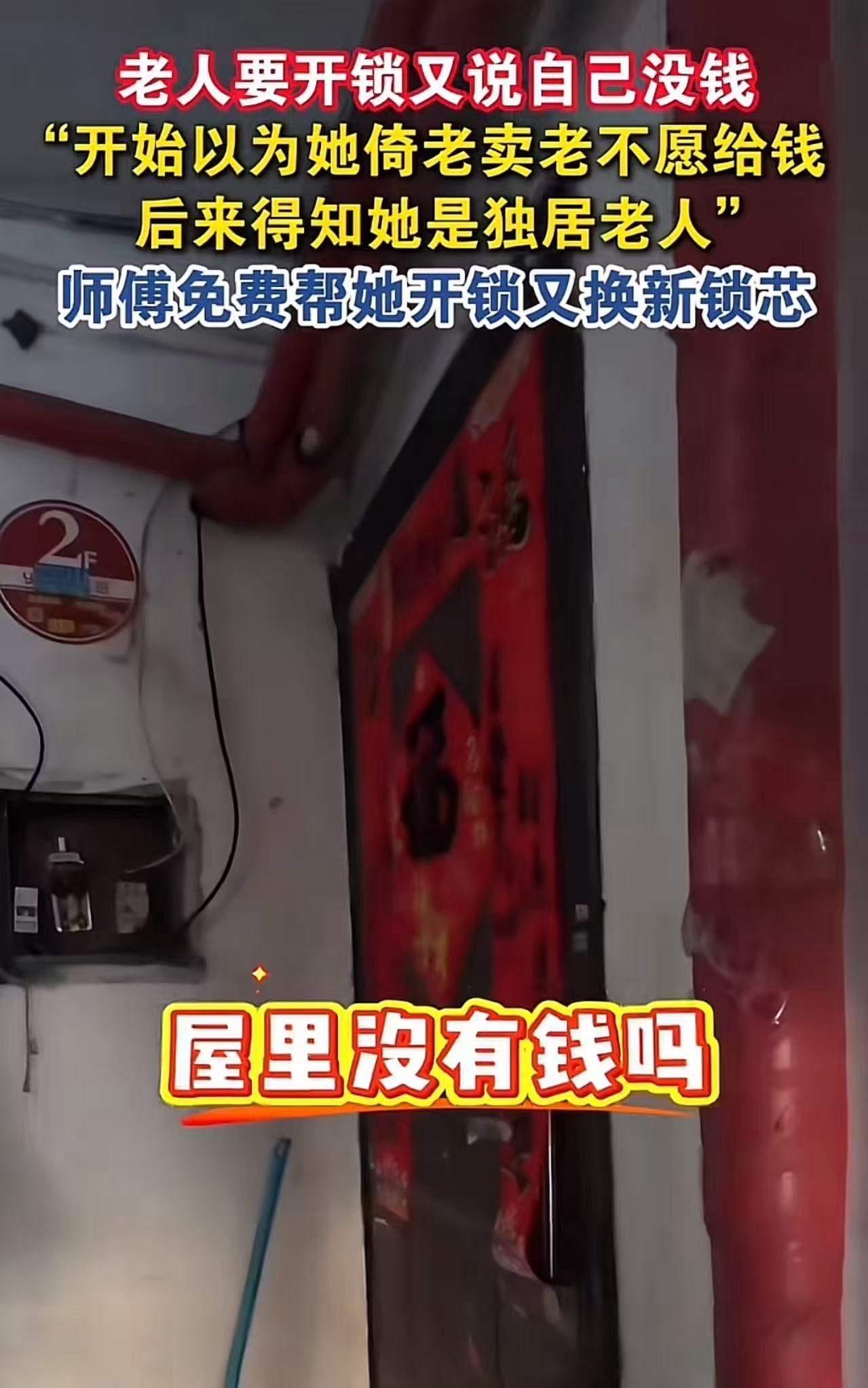 老人找开锁师傅开锁,又说自己没钱。开锁师傅以为老人倚老卖老不愿给钱,后来得知她是独居老人,一番举动,让老人泪目了!网友:这哪里是开锁人啊,你打开的是善良的心幸福的门。 这件事看似简单,却深深触动了无数人的心弦。我们生活中,常常会遇到各种各样的“误解”和“偏见”,尤其是对待老人,有时候一声“没钱”,很容易被误会成不愿意付钱的借口。然而,真相往往比表面复杂得多。 那天,一位年迈的独居老人急匆匆地找到了开锁师傅,眼里满是焦急和无助。门锁坏了,家门紧闭,她进不了家门。老人一边说着“我没钱”,一边请求帮忙。开锁师傅起初心里有些不悦,觉得老人是不是想“赖账”,毕竟现在社会上谁没点防备心?但当他看到老人颤抖的手和满脸的无助时,心里的防备瞬间化为乌有。 事实是,这位老人独自一人生活,儿女远在他乡,生活拮据,连请人帮忙开锁的钱都紧巴巴。她那句“没钱”,是无奈,是羞涩,更是对生活艰辛的无声诉说。 开锁师傅没有选择拒绝,也没有计较报酬。他默默地帮老人打开了门,随后还帮她检查了门锁,确保安全。更暖心的是,他主动提出不收取费用,还留下了自己的联系方式,告诉老人以后有什么困难可以随时找他帮忙。 这一刻,老人眼中闪烁的泪光,像是冰雪融化后的春水,温暖而纯净。她感受到的,不仅仅是开锁的帮助,更是人间的温情和善意。那一扇门,仿佛被打开的,不只是房门,更是通往温暖和希望的心门。 网友们看到这件事后,纷纷留言:“这才是真正的社会温度!”“善良才是最珍贵的财富。”“如果每个人都能多一点理解和包容,世界会更美好。” 这件小事背后,反映的是我们社会中对弱势群体的关怀缺失,也提醒我们每个人都应多一些耐心和同理心。老人不是“赖账”的借口,他们是社会的根,是我们应该尊敬和呵护的对象。 开锁师傅的举动,让我们看到了人性中最美好的一面——善良和无私。或许,我们每个人都应该学会在生活中多一点宽容和帮助,因为你的一次善举,可能会成为别人生命中最温暖的光。 生活不易,但正是这些看似微不足道的温暖瞬间,构成了我们社会的脊梁。你有没有遇到过类似的温暖故事?欢迎留言分享,让更多人感受到这份真情实感。毕竟,打开心门,远比打开锁门,更需要勇气和爱。不靠谱开锁