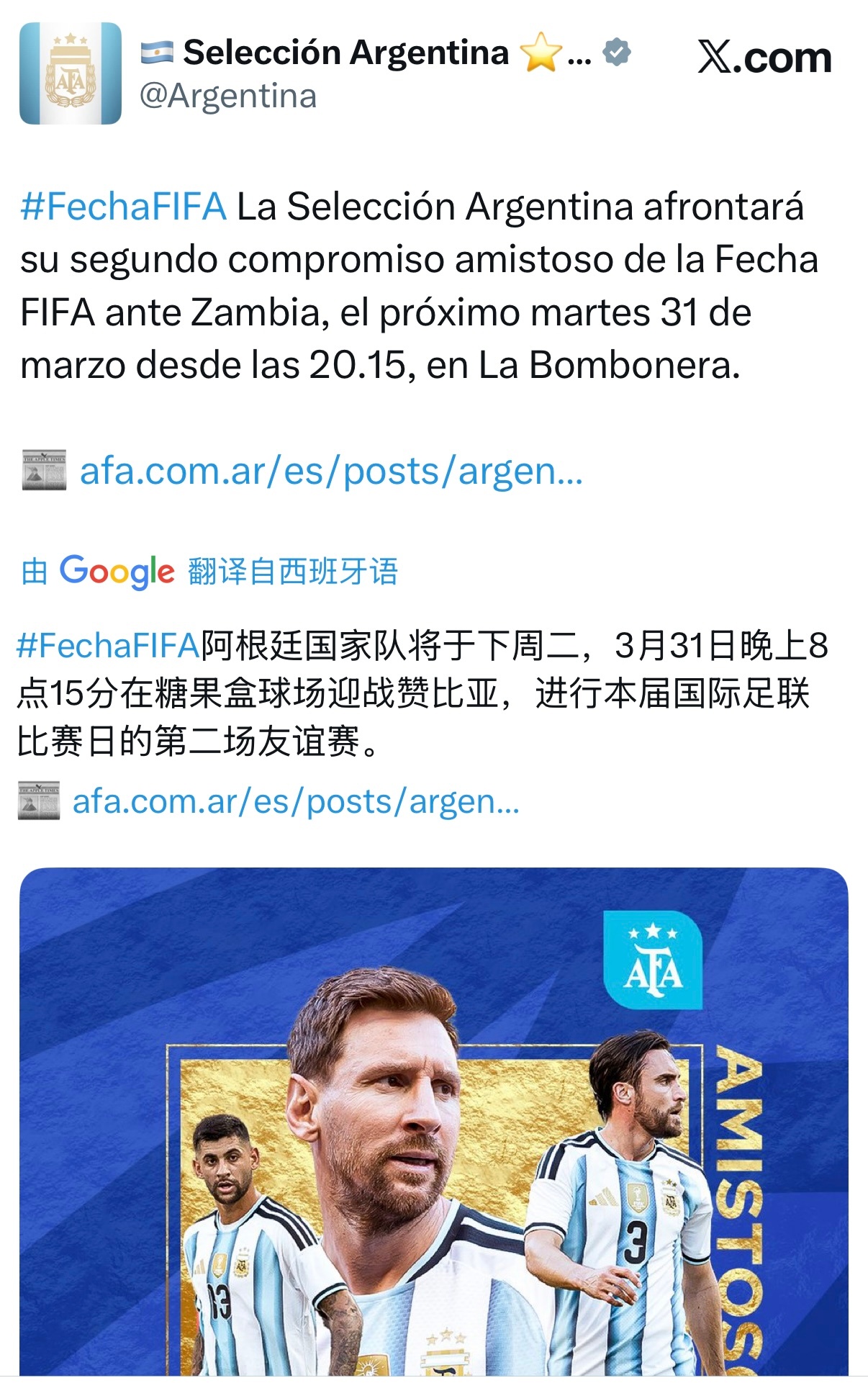 赞比亚🇿🇲将成为阿根廷在3月31日于糖果盒球场进行的第二场友谊赛的对手。梅西