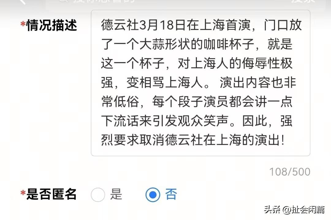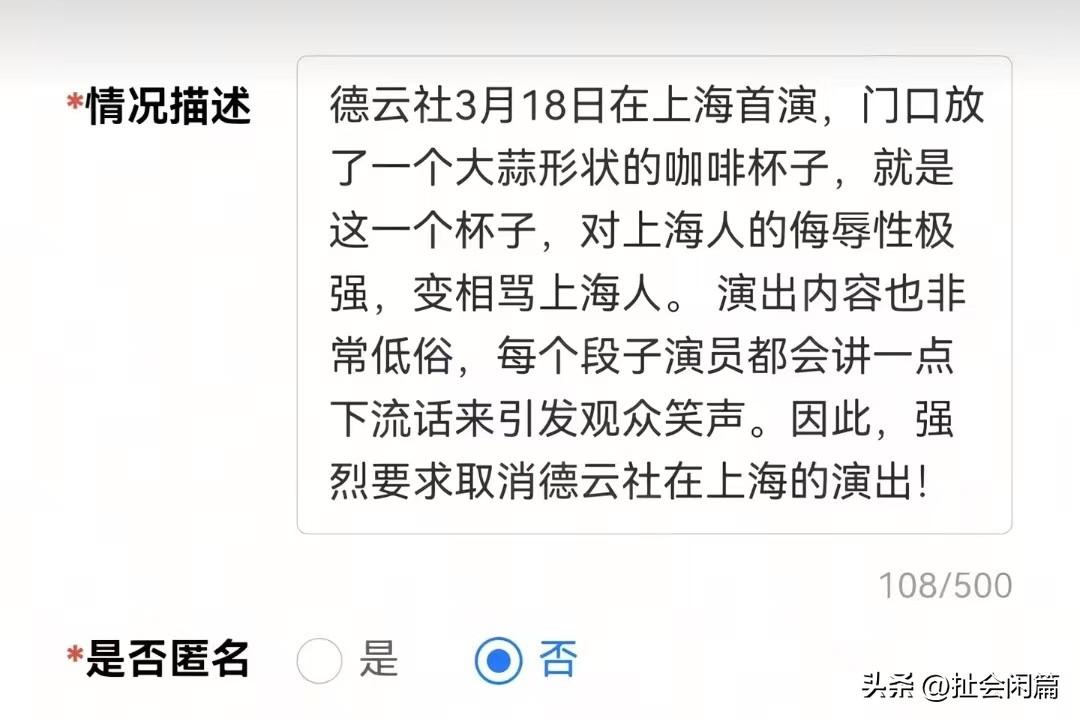 上海德云社被上海人投诉了,理由就是大蒜型的咖啡杯,是对上海人的侮辱,还有演出内容低俗,强烈要求抵制哈哈哈。 不知道这个人是不是能够代表上海人?还是竞争对手派来的,还是恶搞的,大家说说12315会受理吗? 上海人