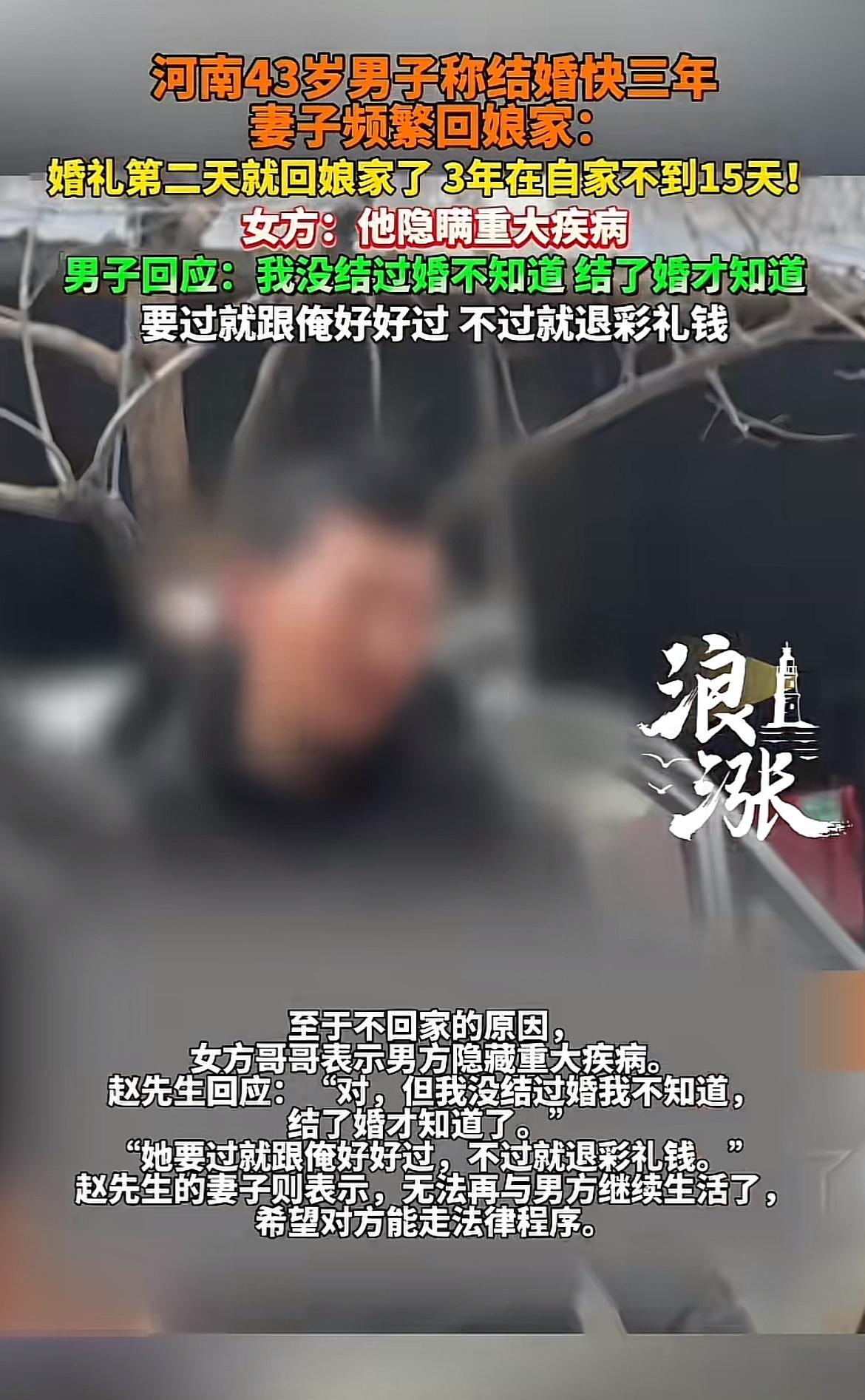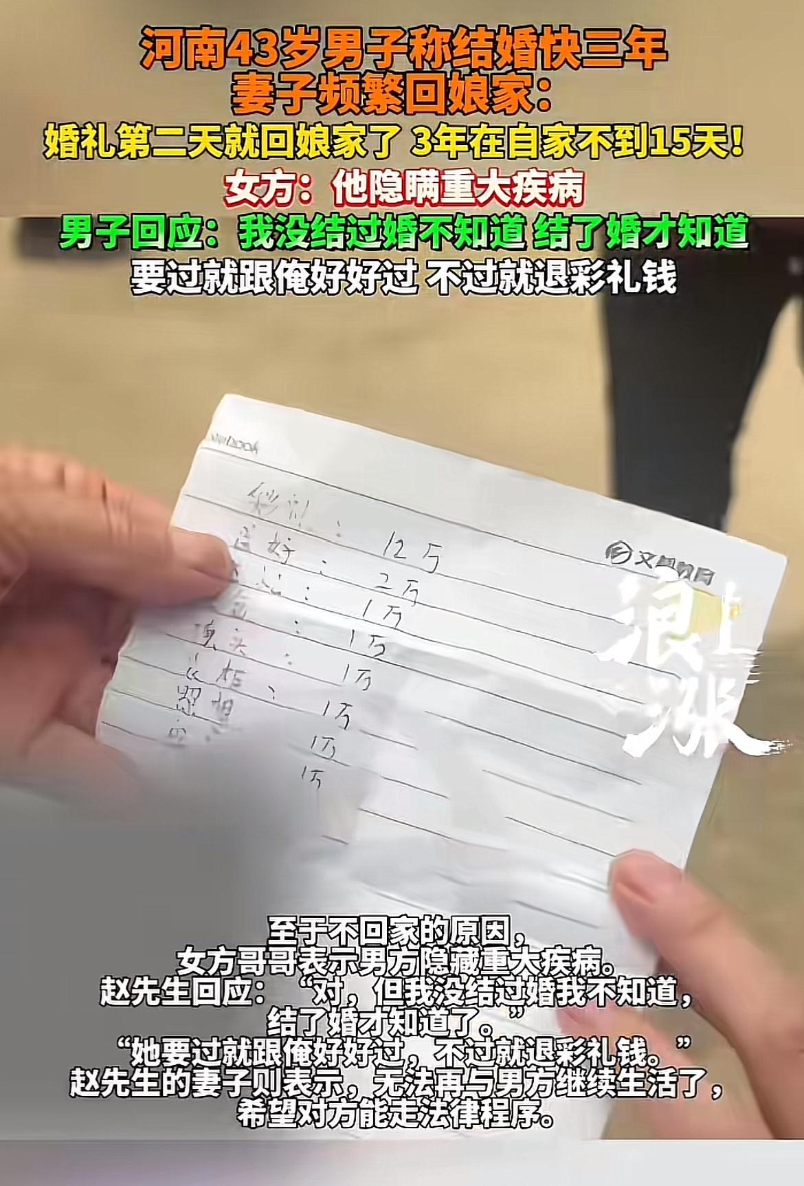 最近河南开封这桩婚姻纠纷太抓马了。43岁的赵先生经媒人介绍结婚,给了12万彩礼,可婚礼第二天妻子就回娘家,三年里在家住不到15天。赵先生觉得是妻子脾气倔,还要求不过就退彩礼。 但女方哥哥指出男方隐瞒重大疾病,赵先生竟称婚后才知道。女方拿出2023年7月录音,当时赵先生还提离婚,嫌弃妻子不做饭。这所谓的重大疾病很特殊,让女方有“守活寡”之感。 从常理看,婚前相处那么久,男方不太可能婚后才知情。网友一边倒地支持女方,男方这侥幸心理可坑惨了自己,彩礼退还比例估计得看双方态度了。
