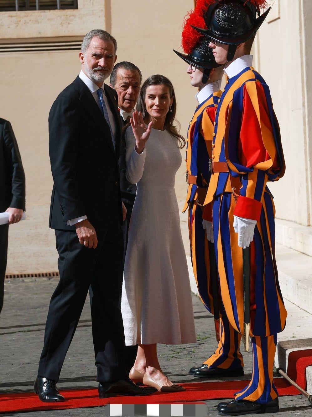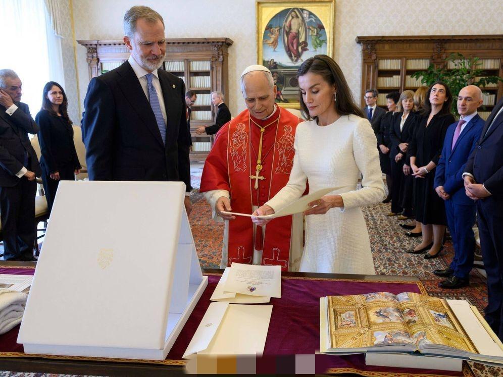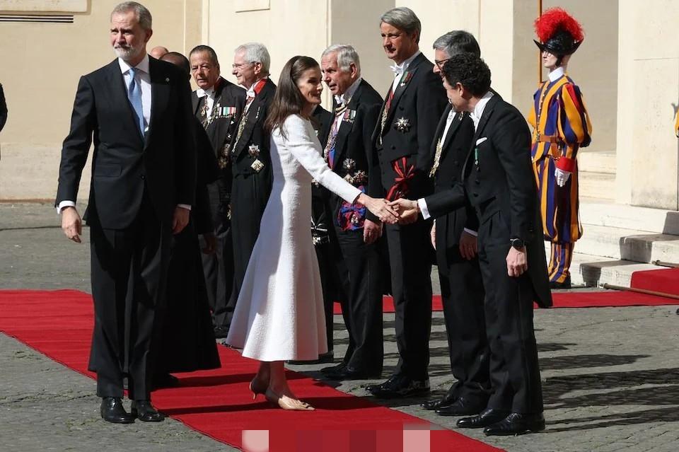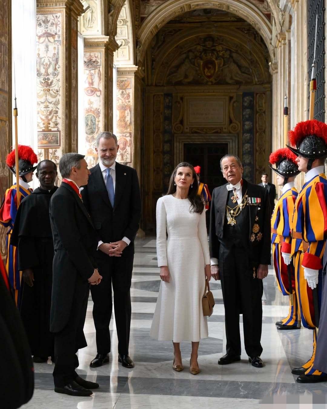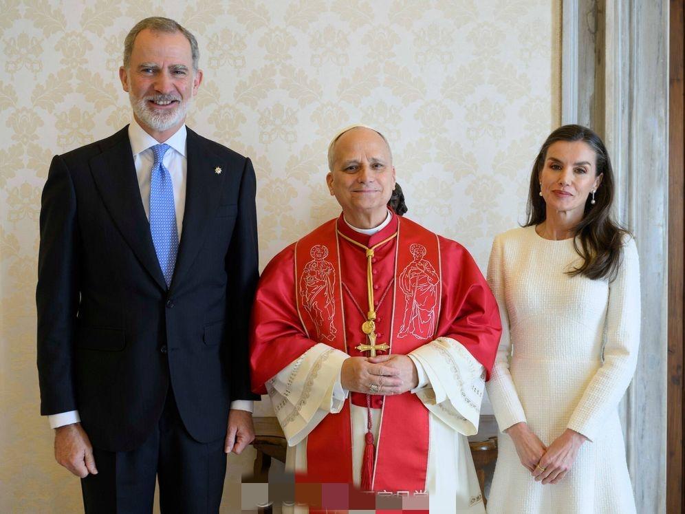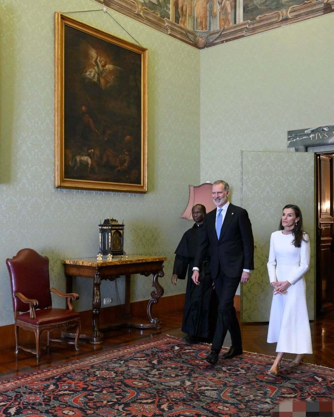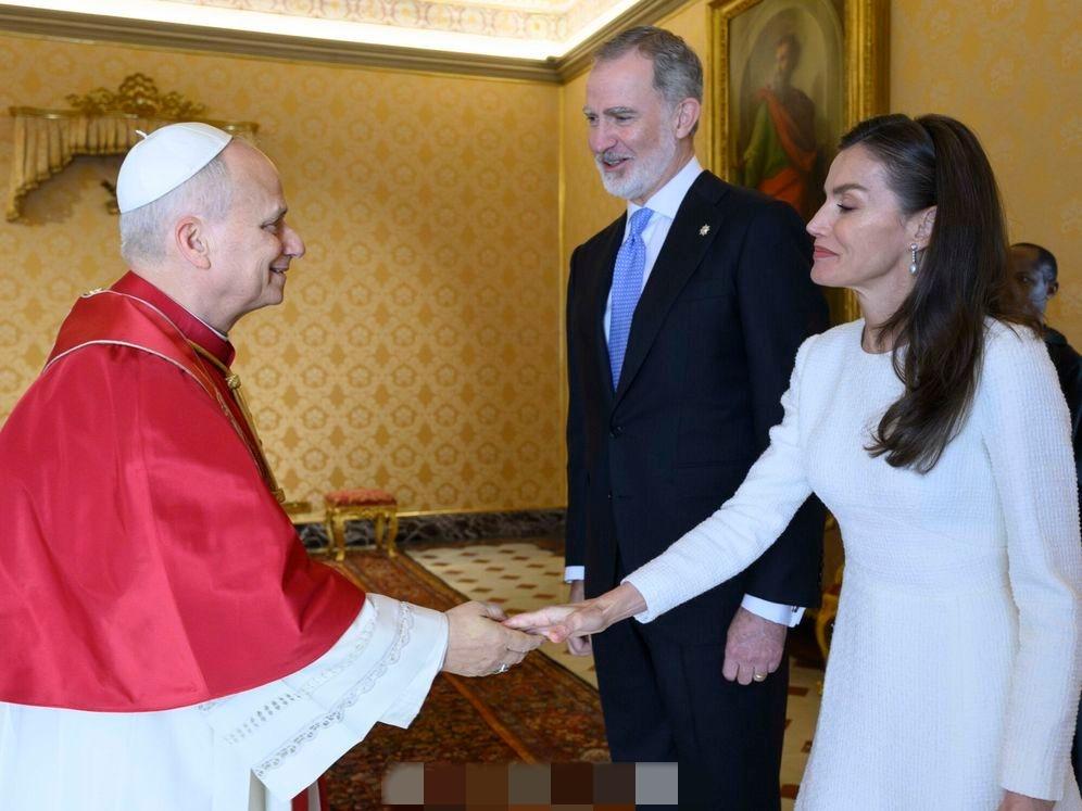 3月20日,西班牙费利佩国王和莱蒂齐亚王后抵达梵蒂冈,一同觐见罗马教皇利奥十四世。 因为西班牙是天主教君主立宪制国家,因此莱蒂齐亚王后这次穿了一身洁白的长款连身裙,披肩秀发,带着珍珠耳坠,优雅端庄。