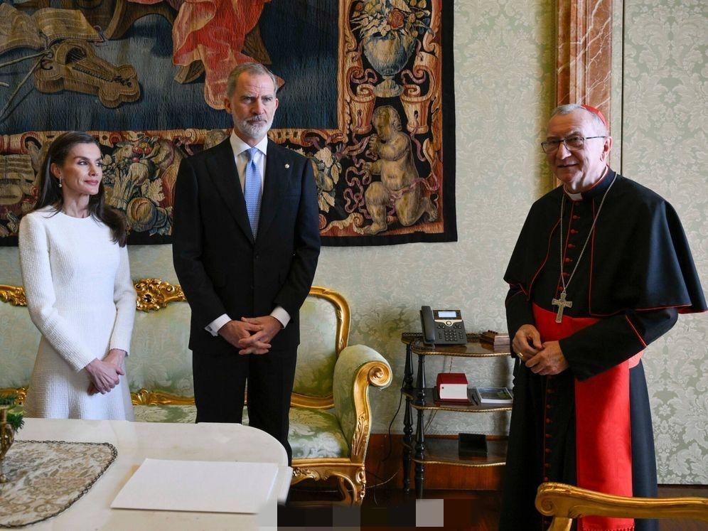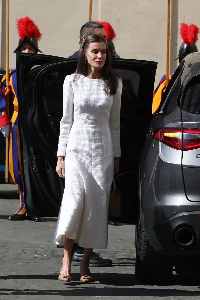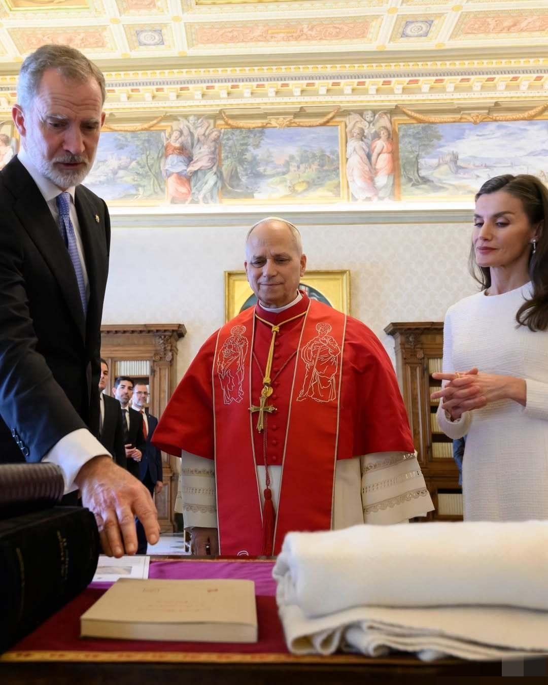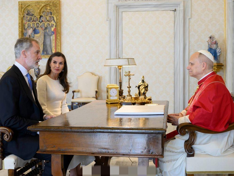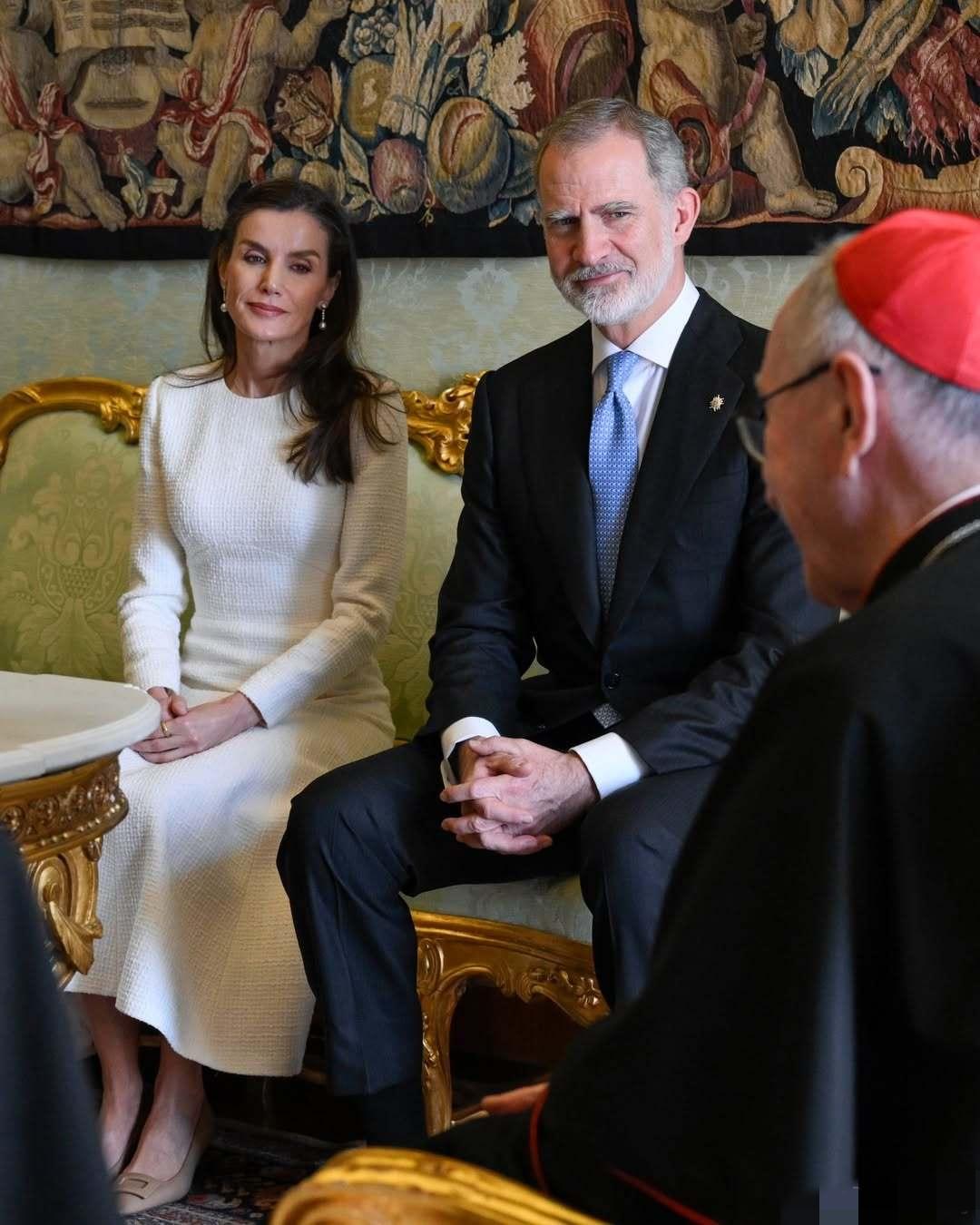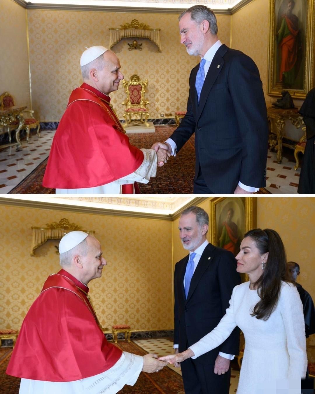3月20日,西班牙费利佩国王和莱蒂齐亚王后抵达梵蒂冈,一同觐见罗马教皇利奥十四世。 因为西班牙是天主教君主立宪制国家,因此莱蒂齐亚王后这次穿了一身洁白的长款连身裙,披肩秀发,带着珍珠耳坠,优雅端庄。
