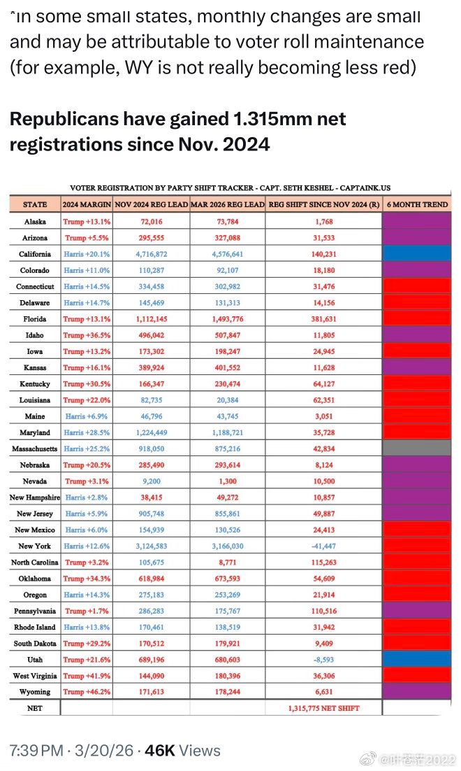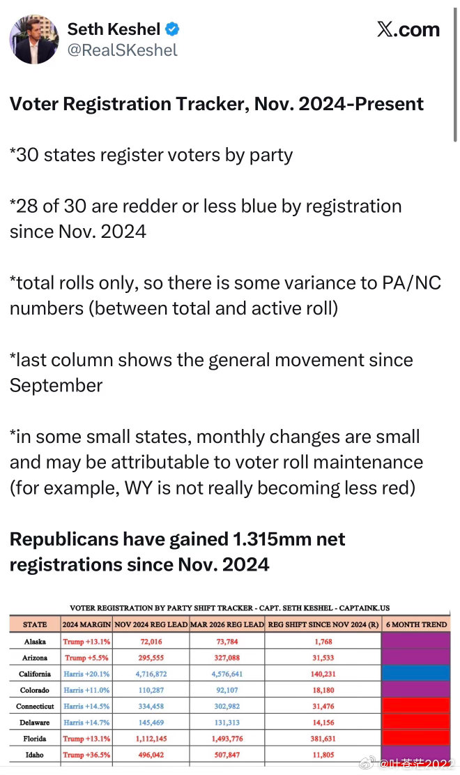 自2024年11月以来,共和党净增登记选民131.5万人。