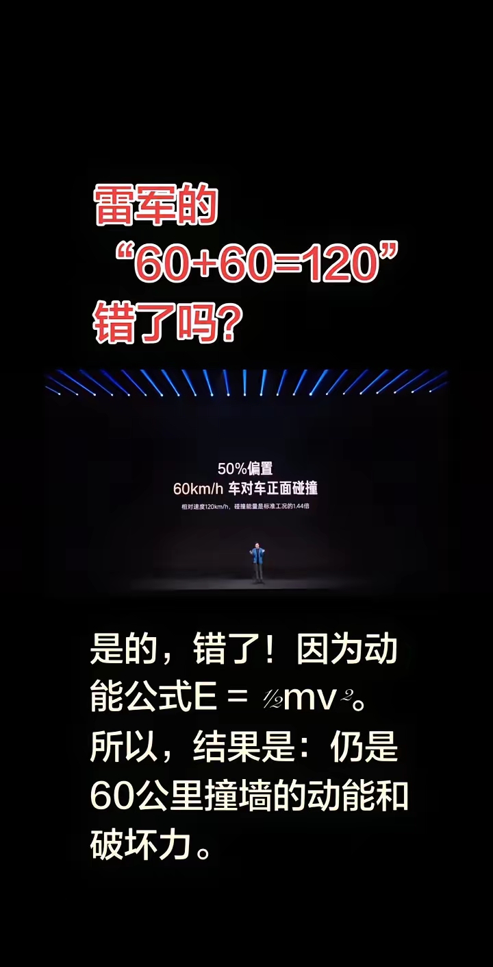3月19日,小米汽车董事长雷军先生在新一代小米苏7的发布会对该车的安全性能作了大篇幅的介绍,用很多2200兆帕超强钢(获得非政府组织颁发的一等奖),防碰撞测试成绩很优秀。他说,两车对向60km时速对撞,相当于120km时速撞上静止的强。他的理由是"60+60=120",看似没毛病,实则漏洞百出,经过各路网络爱因斯坦的缜密分析,引用动能公式E=mv,得出结论是,仍是60公里撞墙的动能和破坏力。这届网友不好糊弄啊,与几年前理想宣传的车身强度1500+1500=3000很是类似。理想同学高中才毕业,理科知识不足可以理解,雷总可是武汉大学的高材生,怎么能犯这么低级的错误呢? 大家觉得,雷总的60+60=120的宣传是有意为之还是无心之失?评论区说说你的看法。