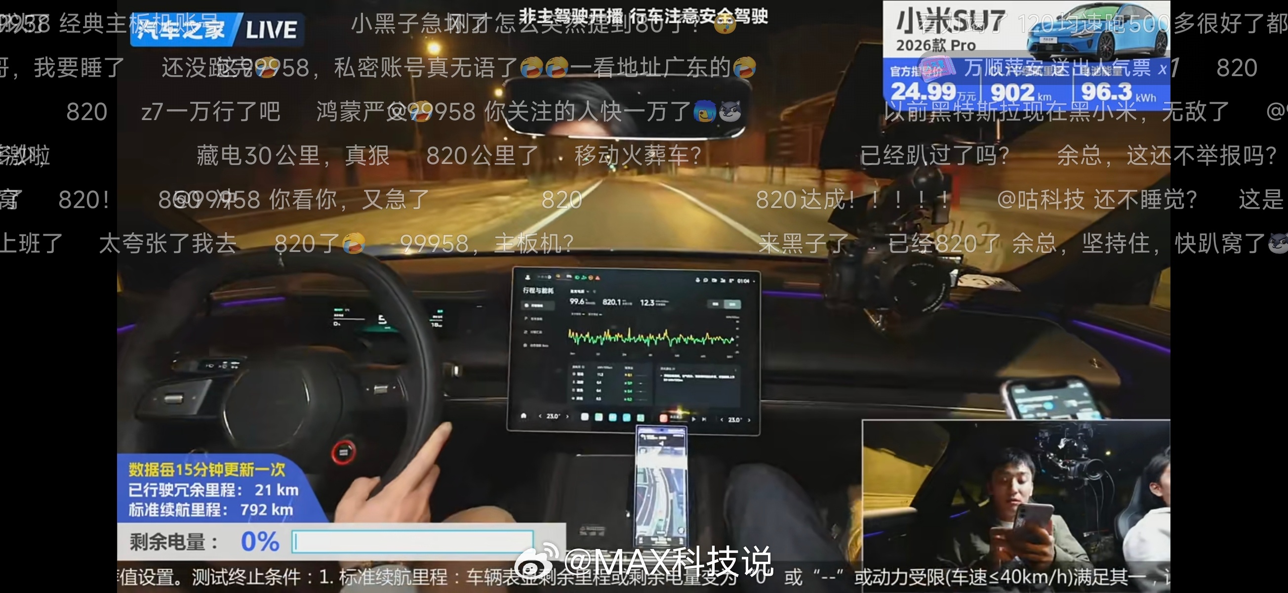 昨晚睡觉前,偶然刷到了汽车之家直播测试小米SU7续航,已经跑了820km,真的猛