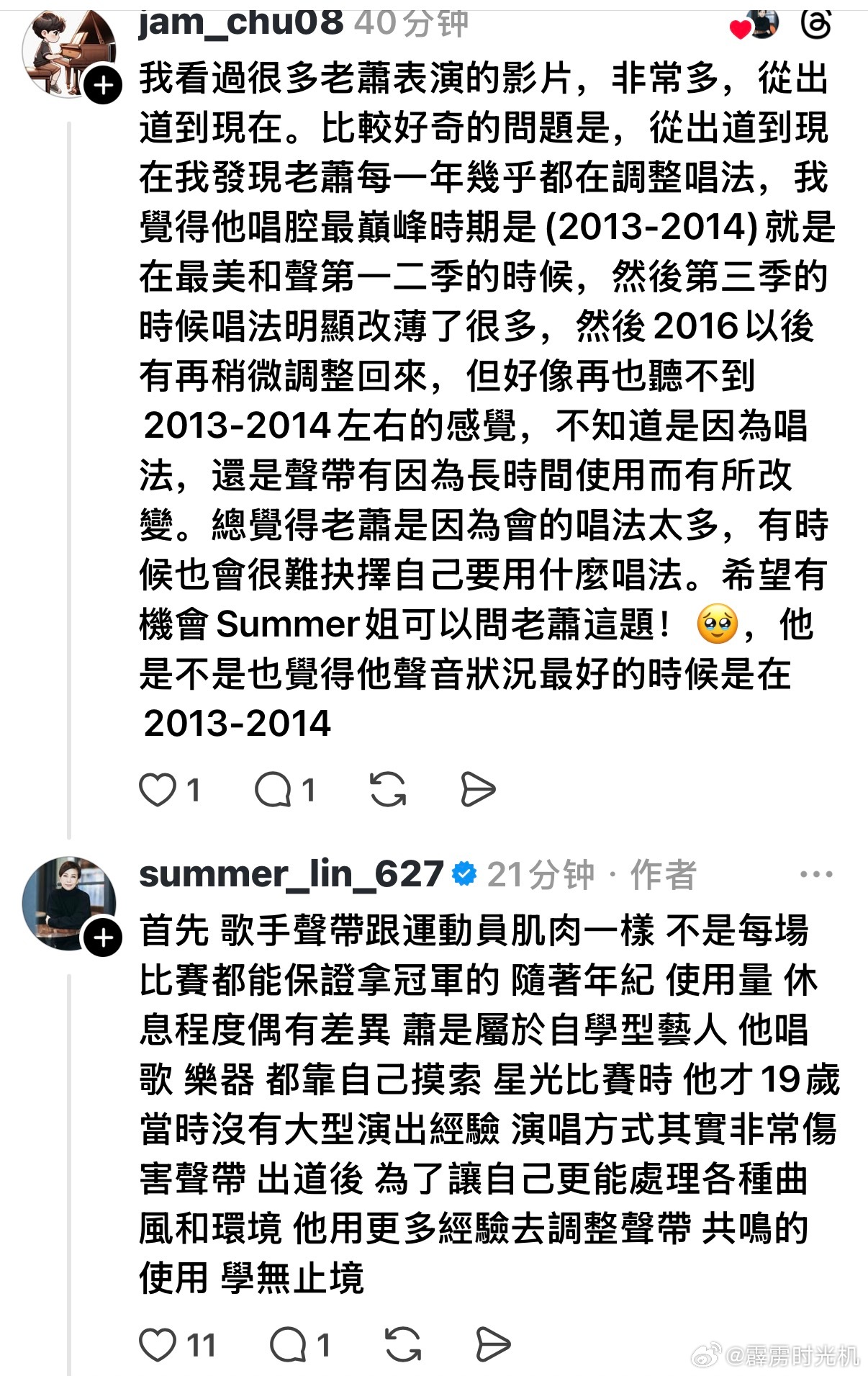 林有慧开放提问,表示从来没有跟萧敬腾大吵过。也回应了关于萧敬腾唱法更改的问题~