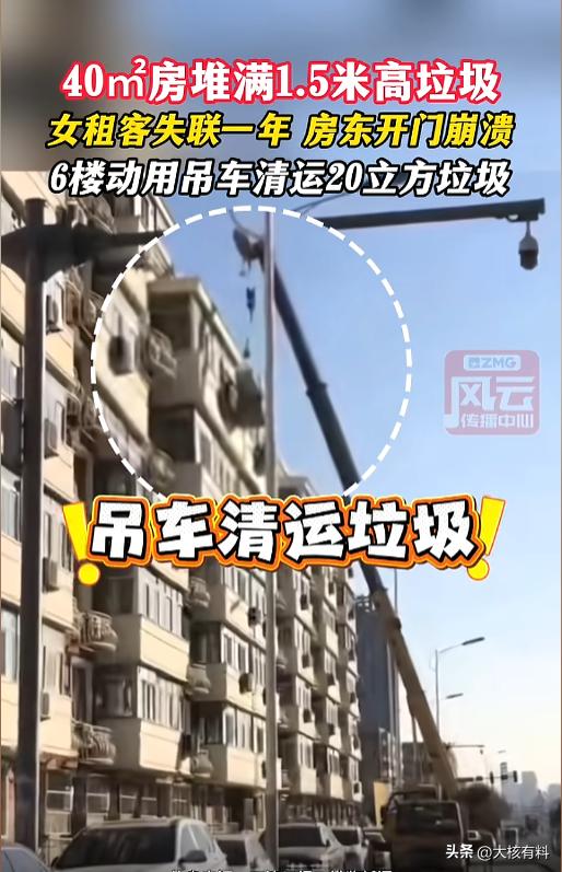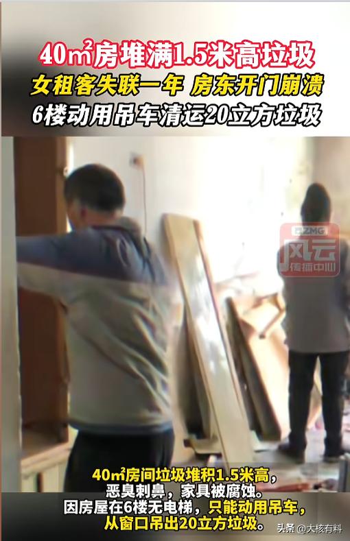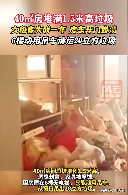 “....天塌了!”近日,天津,一房东几年前房子租给了一位年轻女子,几年来房租付的一直很及时。近一年,双方没有再联系,到了交房租的时候,发现对方失联了。上门一看,惊呆了!房间里垃圾堆得一米多高,臭气熏天!自己40平的房子里清出来20方垃圾! 往外租房子,除了租金以外,更看重租客的人品,希望租客能好好爱护自己的房子,最怕租给那种邋里邋遢的,把自己的房子弄得一团糟。 据媒体3月17日报道,几年前,房东把自己的一个小房子租给了一位年轻女子,一来二去,双方也熟了,后面续租的时候也没再签合同。 这几年,女子的房租付的都很及时,房东也没再来看。今年,租客一年多没有再联系,又到了收房租的时候,眼瞅着还联系不上,房东这才上门。 打开门一看,房东的天都塌了。自己40平的小房里,垃圾堆了有1.5米高。房间里面臭气熏天,进不去人。雇人清理后,竟然清出了20方垃圾。不少家具也受到了污染,不能用了。 由于房子在六楼,又没有电梯,经过和多部门报备后,房主雇了一辆吊车,从外面把垃圾清了出去。 网友看后表示,房东心真大,失联一年都不问,也不怕租户在自己房间里出点事故么?周围邻居难道都发现不了?虽然租客做的很过分,但身为房东,为了自己的房子,为了自己没有麻烦,平时也该多联系一下。 信息来源:《40㎡房堆满1.5米高垃圾,女租客失联一年 房东开门崩溃,6楼动用吊车清运20立方垃圾 (编辑:何佳妮)》风云传播