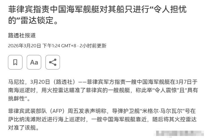 干的漂亮!直接打开火控雷达,菲律宾非常的跳脚!3月20日,根据路透社报道,外媒称,菲律宾军方指责一艘中国海军舰艇在3月7日于南海巡逻时,用火控雷达瞄准了菲律宾的一艘舰艇,称此举“令人震惊”且“具有挑衅性”。菲律宾武装部队表示,导弹护卫舰“米格尔·马尔瓦尔”号在“萨比纳”浅滩(仙宾礁)附近进行海上巡逻时,一艘中国海军舰艇靠近,随后将其火控雷达对准了该舰。 说白了,中国海军在仙宾礁用火控雷达回应菲律宾挑衅,表面是一次海上警戒反制,实则是在捍卫国家领土主权、对菲律宾反复碰瓷的一次强硬亮剑,干得十分解气。 要知道,就在菲律宾不断派舰闯入仙宾礁海域、持续在南海制造事端、还频频拉拢外部势力搅局的节骨眼上,菲律宾军舰又一次非法靠近我方管辖海域,中国海军舰艇依法近距离警戒,并直接打开火控雷达予以警示。菲律宾本以为还能像以前一样肆意挑衅、倒打一耙,结果被我方直接亮明强硬态度,当场跳脚喊冤,这操作活像小偷闯进别人家院子,被主人拿棍警告后反而恶人先告状。 可这绝非我方主动挑衅,而是菲律宾一再非法侵闯、步步紧逼逼出来的正当反制。仙宾礁自古以来就是中国领土,中国对南海诸岛及其附近海域拥有无可争辩的主权。近年来菲律宾在美国怂恿下,屡次派军舰、海警船闯入仙宾礁、仁爱礁附近,干扰中方正常巡逻执法,还多次上演“碰瓷”戏码向国际社会卖惨。中方多次克制劝阻,菲律宾却视而不见、变本加厉,在这种情况下用火控雷达发出严厉警告,完全是合理合法的自卫举措,这账怎么算都轮不到菲律宾指责。 说实话,菲律宾所谓“令人震惊、具有挑衅性”的指责,完全是倒打一耙的双标表演。明明是菲律宾军舰非法侵入中国海域在先,不断挤压中方舰艇安全空间,中方只是采取必要警戒措施驱离,菲律宾却反过来倒泼脏水,把自己包装成受害者。这种贼喊捉贼的把戏,不仅骗不了国际社会,更掩盖不了其侵犯中国主权的真实面目。 并且,中国在南海的行动始终克制专业,火控雷达锁定只是警示而非攻击,已经给足了菲律宾面子。换作其他国家面对反复侵闯主权海域的行为,采取的措施只会更加强硬。中方之所以只是锁定警示,目的是逼菲律宾停止挑衅、回归理性,而不是真要发生海上冲突,可菲律宾却不知收敛,反而借机炒作,实在是不识好歹。 更关键的是,菲律宾之所以敢在南海频频跳脚,背后全是美国在撑腰。美国不断拉拢菲律宾搞联合巡航、军事演习,向其输送武器装备,怂恿菲律宾在南海对华挑衅,试图把南海搞乱以牵制中国。菲律宾甘愿当美国马前卒,以为有外部势力撑腰就能侵占中国岛礁,却忘了在主权问题上,中国从来不会退让半步。 要清楚,历史早已证明,在国家主权和领土完整问题上,中国军队说到做到,任何挑衅都必将付出代价。当年在南海应对各类侵权挑衅,中方始终坚持有理有利有节,既守住底线,也坚决反制。菲律宾这次被火控雷达锁定,不过是再次尝到挑衅中国主权的苦果。 而未来,只要菲律宾继续非法侵闯仙宾礁等中国海域,中国海军必然会继续采取更强硬的警戒和反制措施,坚决捍卫主权。菲律宾若是执迷不悟、继续跟着美国玩火,只会在南海碰得头破血流。关键转折点就看菲律宾是否能认清现实、停止侵权挑衅,可照其目前不断跳脚炒作的姿态,大概率还会继续挑衅,最终只会自食恶果。 说到底,中国海军用火控雷达回应菲律宾挑衅,本质是捍卫国家主权的正当举措,既专业又强硬。菲律宾跳脚指责不过是心虚的表现,所谓“挑衅”更是无稽之谈。在南海主权问题上,中国立场坚定不移,任何侵权碰瓷行为,都必将遭到坚决回击。 以上是小编个人看法,如果您也认同,麻烦点赞支持!有更好的见解也欢迎在评论区留言,方便大家一同探讨。
