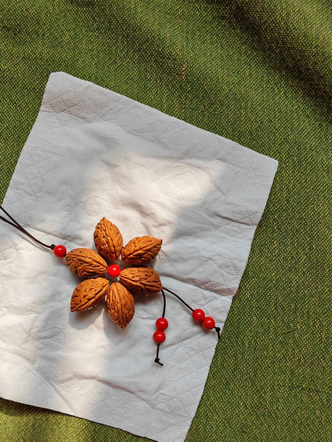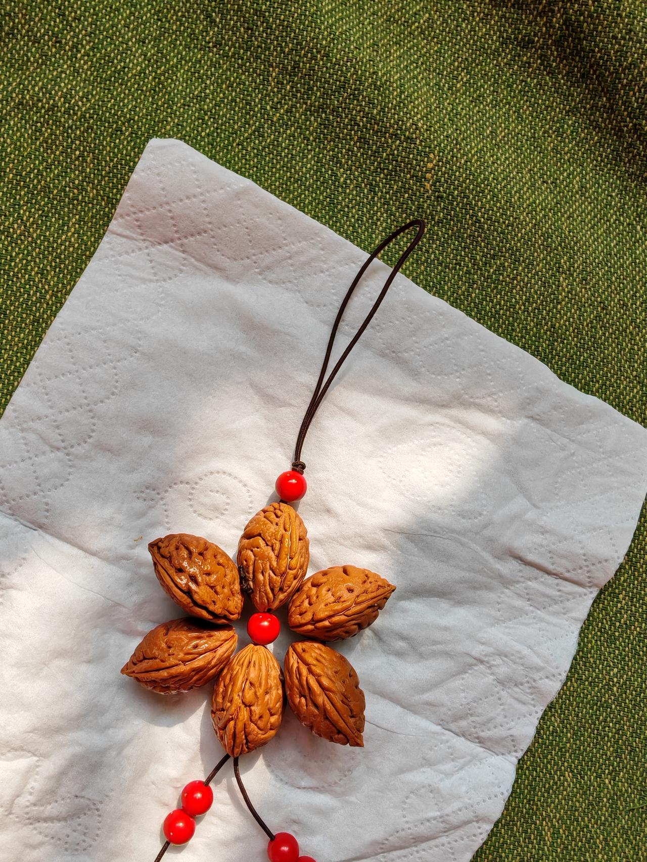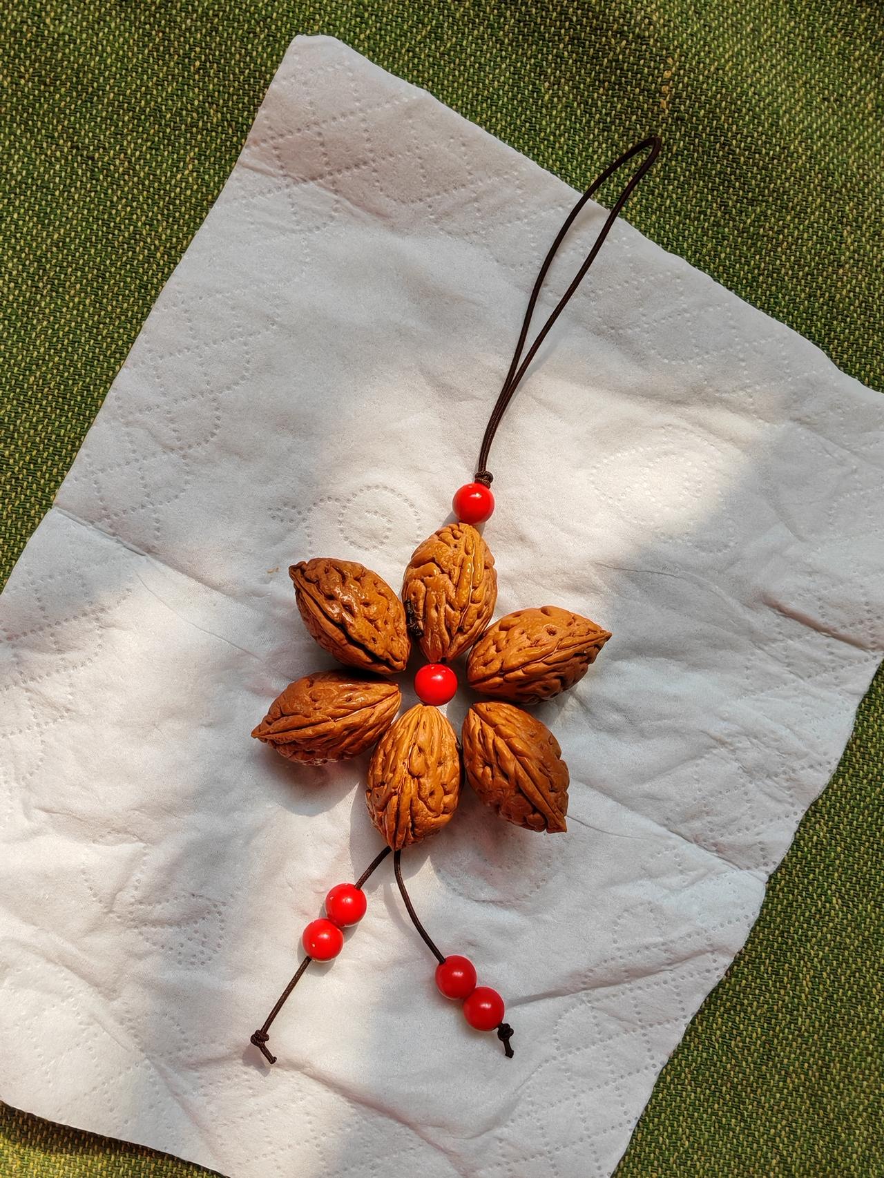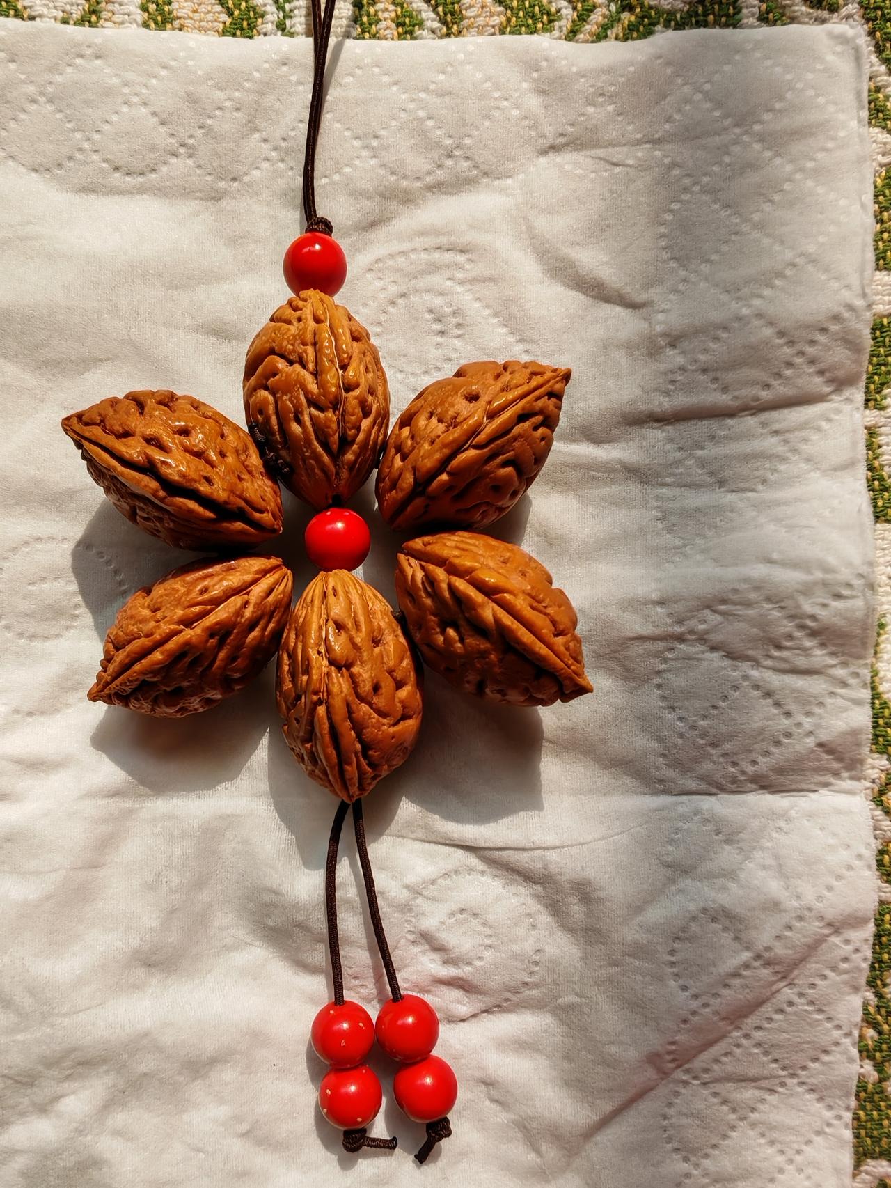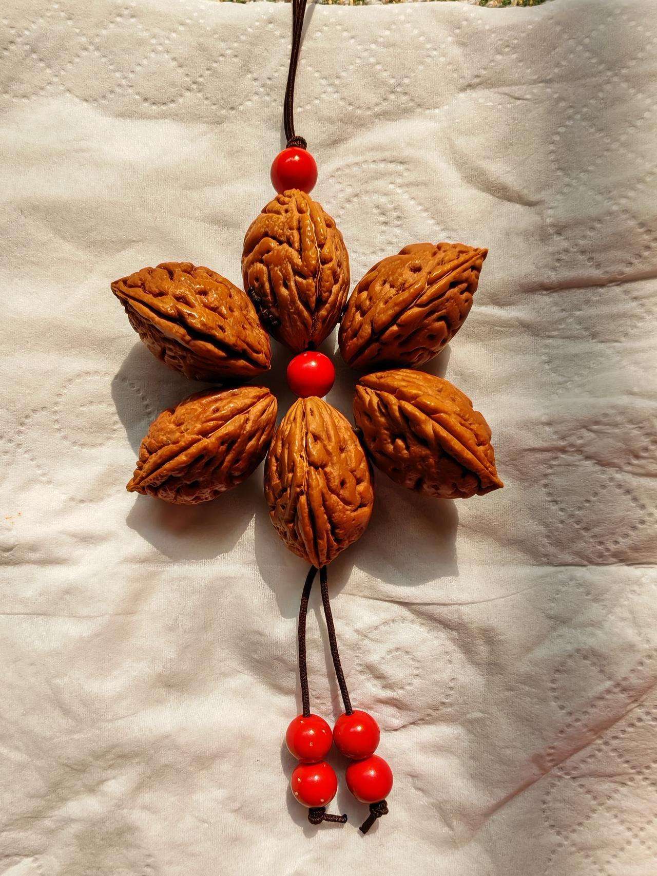 用桃核做朵花,6枚花瓣66顺。 这种碧桃油性大,上色快,盘了两个小时,颜色就变得如此美丽! 这个用做车饰也很好看的。 圆桃核一个花的梦!