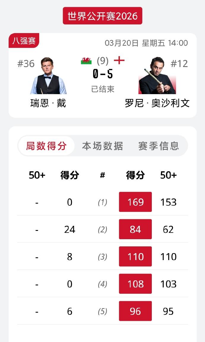 斯诺克:2026玉山世界公开赛奥沙利文单杆153分创纪录,四强阵容出炉! 北京时间3月20日,2026玉山世界公开赛结束¼决赛的争夺,在一场焦点战中,奥沙利文5-0横扫瑞恩戴,其中在第一局创造历史打出单杆153分!在比赛中,奥沙利文先获得16分罚分,随后打出单杆153分,单局总得分169分,创造史上第二高的单局单方球员总得分纪录。该项第一高分纪录为178分,由吉米罗伯逊在2021苏格兰公开赛创造。当时吉米获得44分罚分,随后打出单杆133分,这局比分为178-6,分差172分,这也是史上分差最大的一局比赛。 其它比赛,中国独苗吴宜泽同样带来顶级表现,全场轰出单杆83、140、77、109分,4-0领先,并最终以5-1轻取艾伦,晋级四强!吴宜泽将在半决赛会师奥沙利文。 最终,四强出炉,奥沙利文VS吴宜泽,特鲁姆普VS塔猜亚。 赛果: 3月20日(周五)【1/4决赛,9局5胜制】 14:00 马克·艾伦 1-5 吴宜泽 14:00 瑞恩·戴 0-5 罗尼·奥沙利文 19:30 贾德·特鲁姆普 5-1 侯赛因·瓦菲 19:30 塔猜亚·乌努 5-1 加里·威尔逊 赛程: 3月21日(周六)【半决赛,11局6胜制】 14:00 罗尼·奥沙利文 vs 吴宜泽 19:30 贾德·特鲁姆普 vs 塔猜亚·乌努