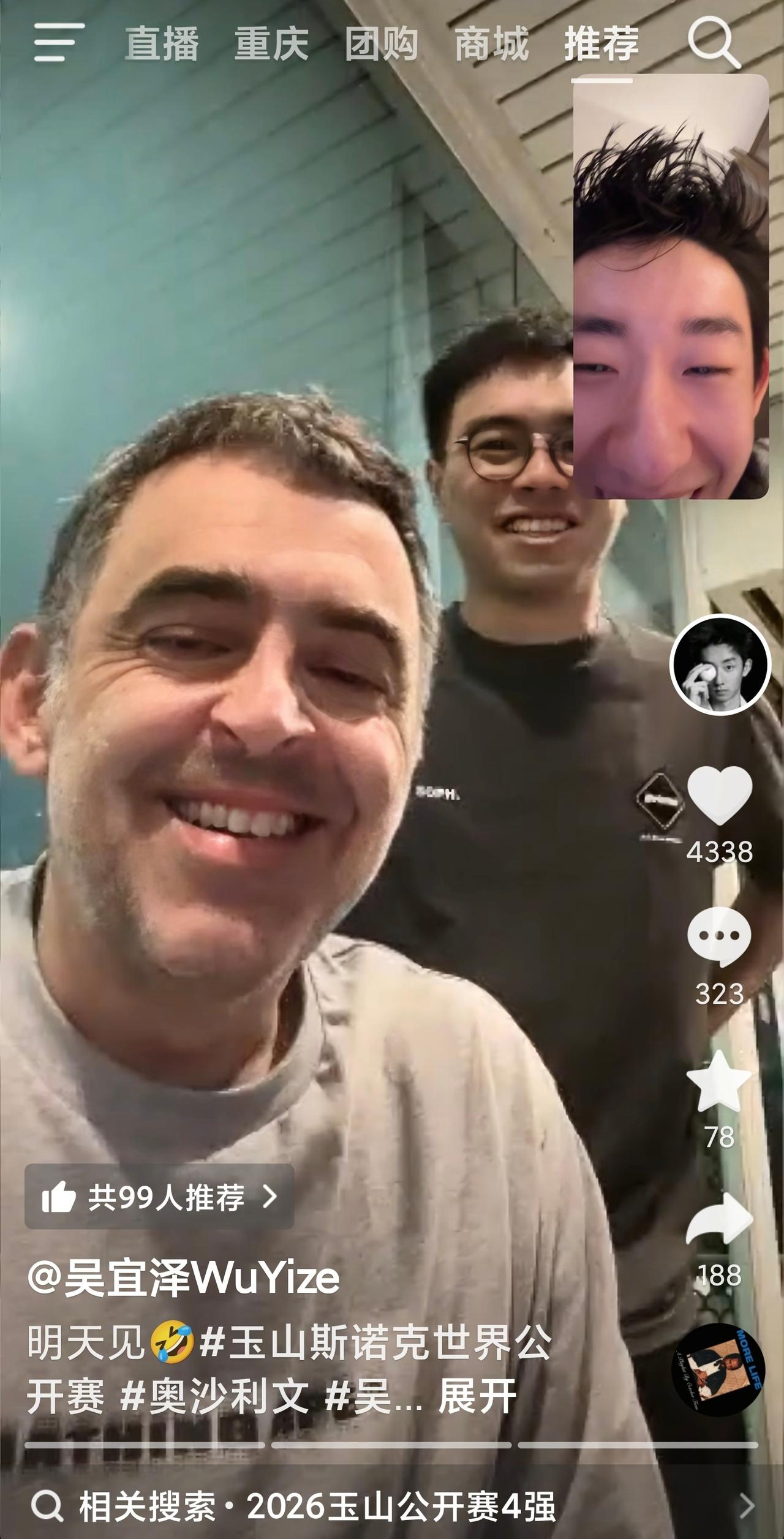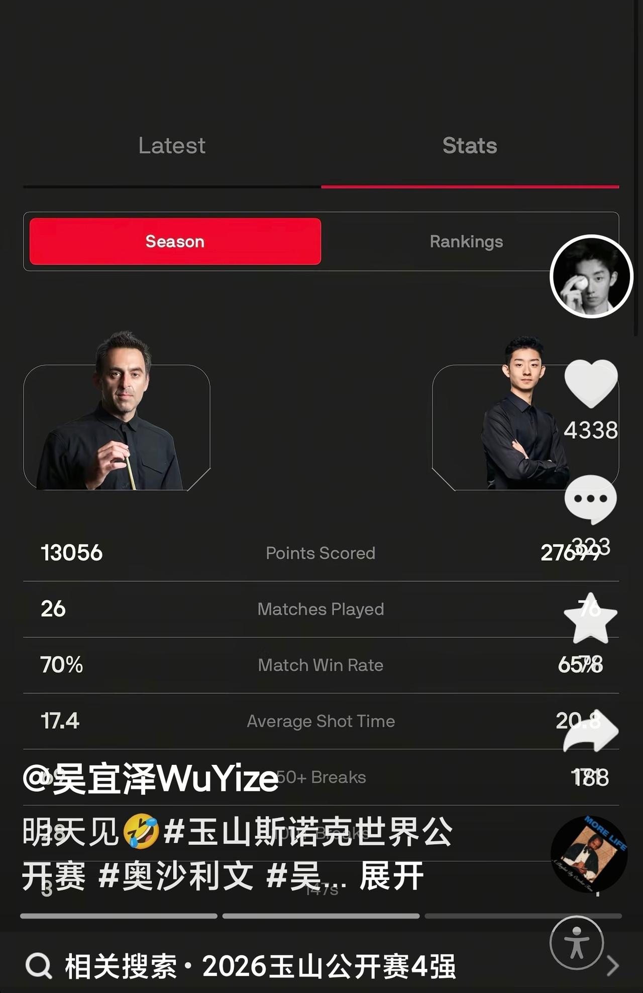 吴宜泽晒出动态:明天见。看着视频截图,一下子没崩住。 今天下午奥沙利文和吴宜泽打半决赛,有种预感,虽然奥沙利文没煮面,但大概率会被吴公子大胜。