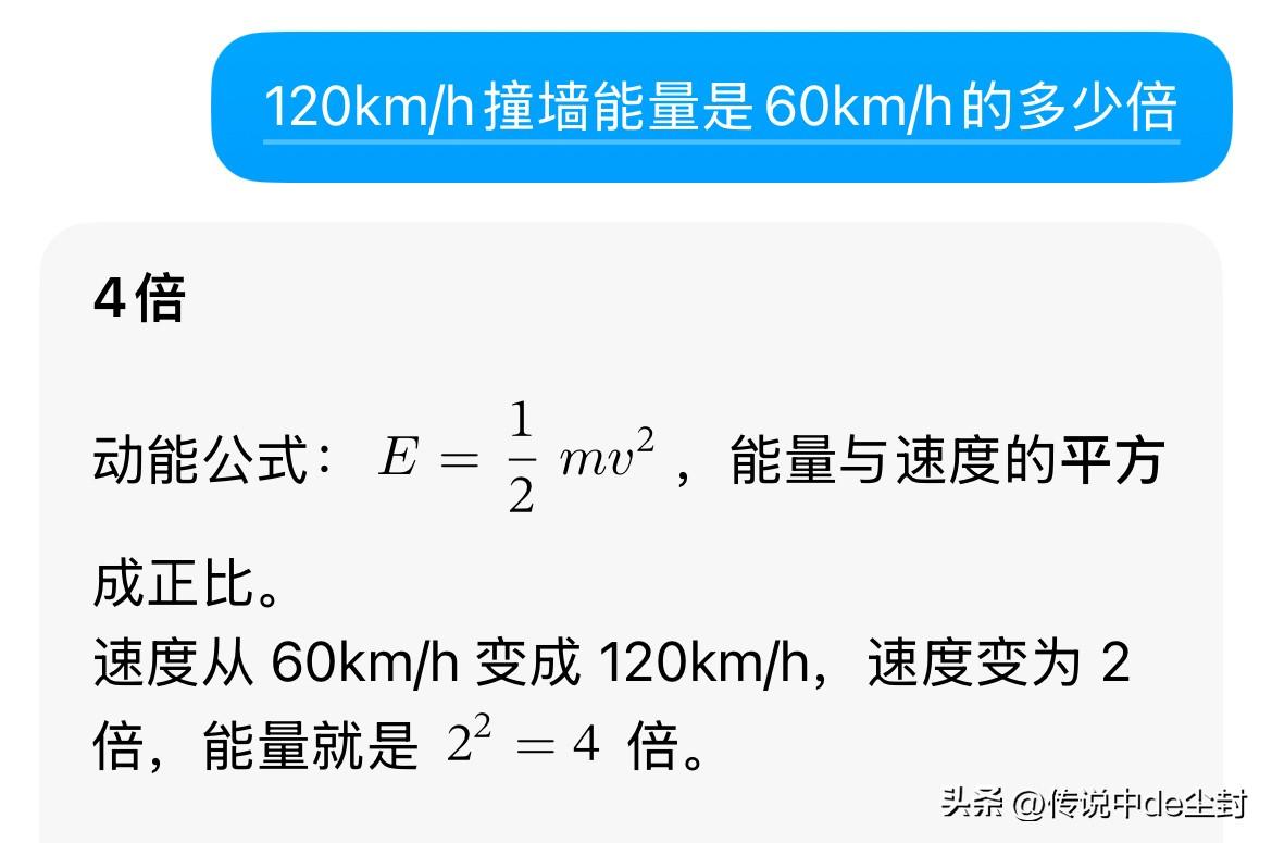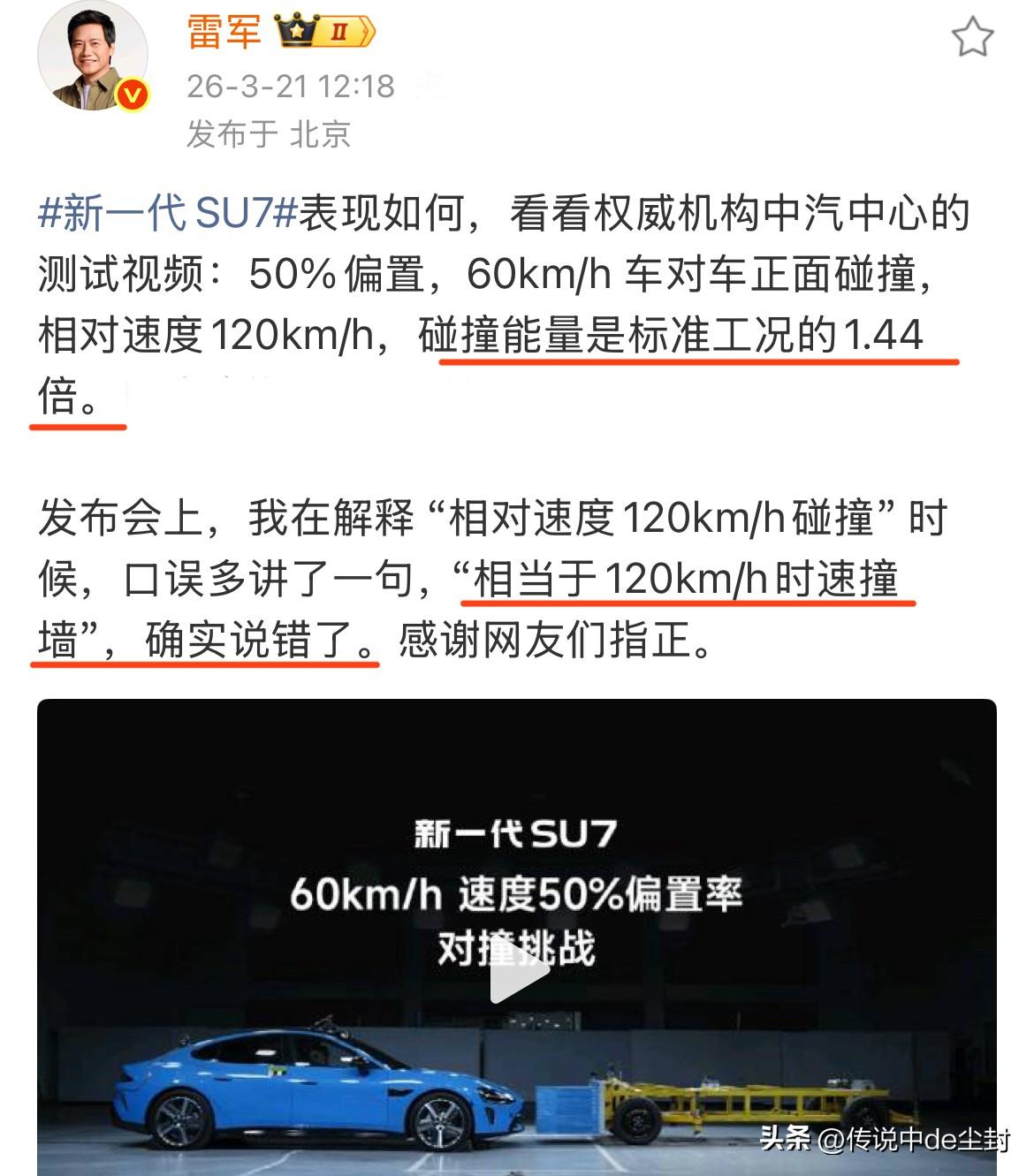 雷总格局可以的。 重新解释了一下新一代SU7发布会上“相对速度120km/h碰撞”的说法,碰撞能量是标准工况的1.44倍,确实不能等于120km/h撞墙。 因为能量与速度的平方成正比,120km/撞墙能量是60km/h的4倍(图二)。 雷总认识到有不妥的地方,就立马更正,这在其他车企,确实是会比较少见的……