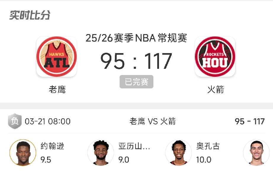 11连胜终结!火箭22分大胜老鹰! 北京时间3月21日,NBA常规赛,休斯顿火箭主场迎战亚特兰大老鹰,最终以117-95大胜22分,亲手终结了对手联盟现存最长的11连胜 。 说真的,老鹰这波11连胜势头太猛。 一路从东部下游冲到前七,攻防都打出了顶级水准,没人想到会栽在刚经历两连败的火箭手里。 首节双方还在交替拉扯。 杜兰特单节轰下10分,带队打出18-6的攻势,首节结束就把分差拉到8分。 第二节老鹰回过神,直接打了一波10-0的反扑,眼看就要反超。 关键时刻还是杜兰特站出来,连中三分加暴扣,硬生生稳住局势,半场结束火箭依旧带着8分领先。 真正的分水岭,在第三节。 火箭直接开启进攻模式,单节轰下39分,净胜对手17分,分差直接拉到25分,最多时领先到34分,比赛彻底没了悬念。 这场球赢的,真不是靠一个人。 杜兰特全场25分6助攻,0失误,正负值+25,稳得离谱;申京15分9篮板10助攻,差1个篮板就拿到三双,第三节6次助攻盘活全队;全队6人得分上双,三分命中率飙到47% 。 反观老鹰,全场三分35投仅9中,命中率只有26%,之前的进攻火力彻底哑火,就算沃克拿下21分,也根本填不上坑。 竞技体育从来没有永远的不败神话。 老鹰的11连胜不是运气,火箭的大胜也不是偶然。能赢下硬战,靠的从来都是全队的拼劲和稳定发挥。