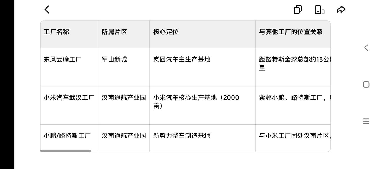 图一这张展示的是汉南区域,重点标注了小米汽车、小鹏汽车、吉利路特斯等新势力工厂,范围集中在汉南片区。 而东风云峰工厂位于武汉经开区军山新城(云峰大道8号,凤凰工业园附近),和图里的汉南片区是相邻但不同的两个区域,不在这张图的取景范围内。