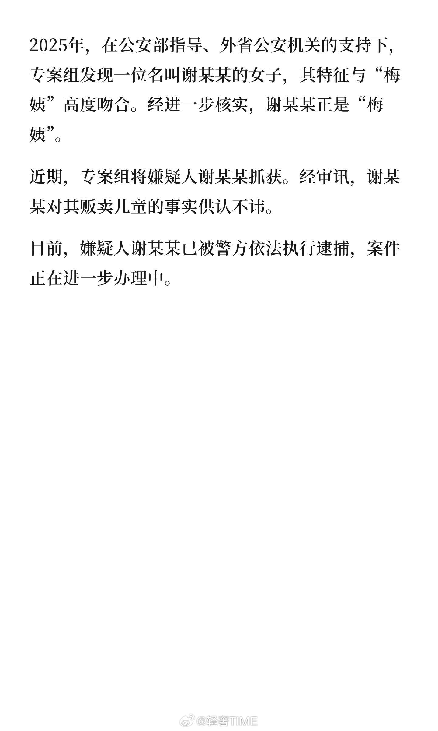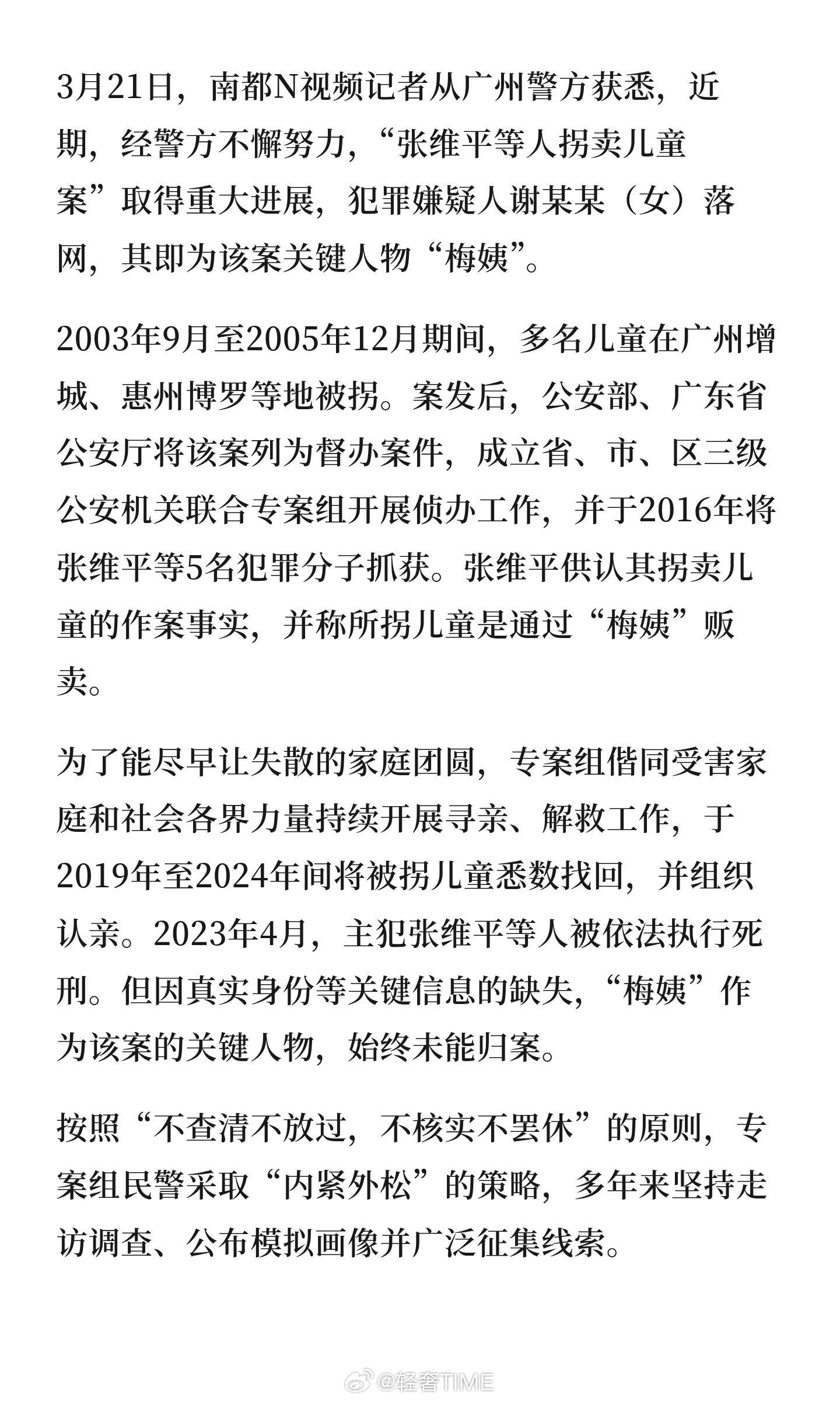 梅姨被逮捕2003年9月至2005年12月期间,多名儿童在广州增城、惠州博罗等地被拐。案发后,公安部、广东省公安厅将该案列为督办案件,成立省、市、区三级公安机关联合专案组开展侦办工作,并于2016年将张维平等5名犯罪分子抓获。张维平供认其拐卖儿童的作案事实,并称所拐儿童是通过“梅姨”贩卖。