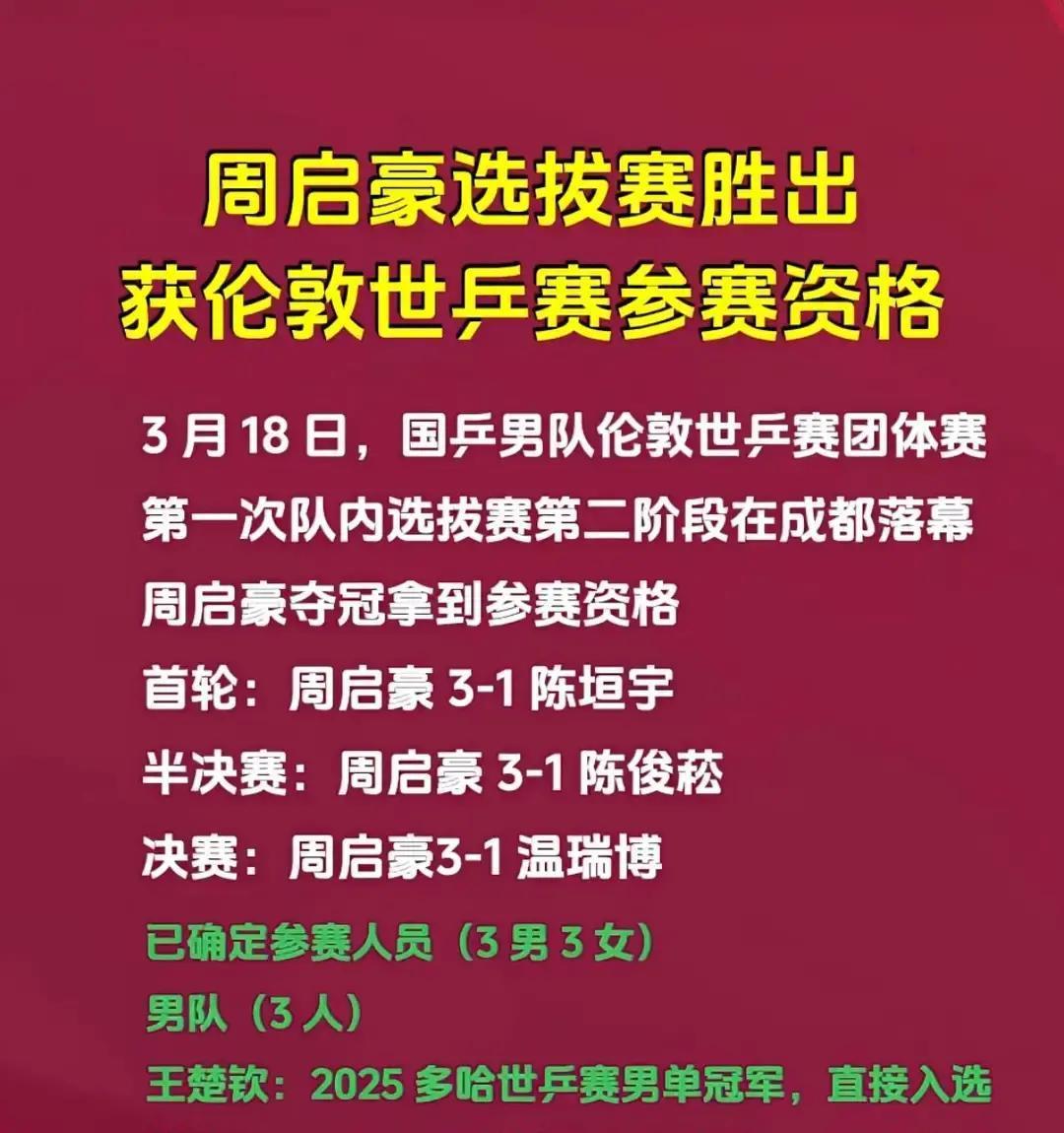 周启豪拿到伦敦世乒赛直通门票后, 很多人担心温瑞博没有了参赛资格, 毕竟作为2026开年国乒最亮眼的小将, 被所有人寄予厚望, 不仅仅是因为他拿到冠军赛亚军, 更重要的是他让球迷看到了未来希望, 自从林诗栋连续输给外协后, 所有人都对国乒未来的接班人产生担忧, 由于梁靖崑状态严重下滑, 目前国乒只能依靠王楚钦一个人苦苦支撑, 重庆冠军赛上爆冷输给松岛辉空, 国乒就失去了最有利的竞争砝码, 好在小将温瑞博杀出重围,一鸣惊人, 让球迷重新看到了国乒希望, 原本以为温瑞博会延续火热手感, 拿到伦敦世乒赛门票, 但偏偏决赛又输给了周启豪, 很多人质疑周启豪的真正实力, 作为国乒老将,曾经连马龙和樊振东都是他的手下败将, 但近几次大赛来看, 启豪的实力已经大不如前, 这次世乒赛队内选拔, 谁也没想到这位老将再次突出重围, 目前世乒赛已经确定3人,分别是王楚钦,林诗栋,周启豪, 但还有两个名额尚未确定, 最终谁来替补参赛也是要根据教练员的意见来定, 所以温瑞博还是有很大概率获得世乒赛参赛资格的