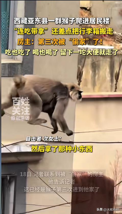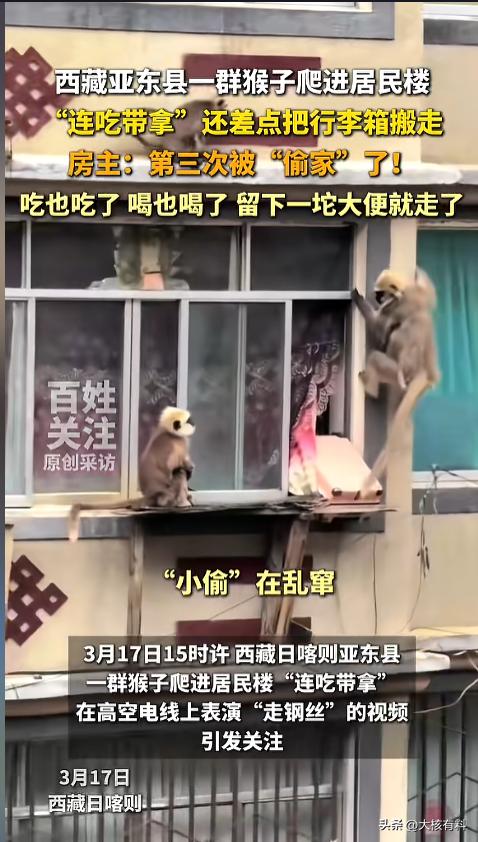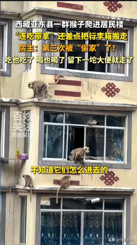 “真是群强盗啊!”3月17日,西藏日喀则,一居民楼被群猴强盗个光顾了。它们闯进屋里,连吃带喝,还搁桌子上留了一坨屎。吃饱喝足后,它们踩着楼檐和电线离开了,走的时候还试图把行李箱搬走。业主哭诉:我家被猴子光顾三回了! 有时候,住的地方自然环境太好,也是件苦恼的事。自然环境好,就意味着周围有不少野生动物邻居,时不时的就会来串个门,有些还比较礼貌,有的可能就会硬闯,甚至明抢。 据媒体报道,事发当日,一伙猴群闯进了这个居民楼,里面有三户人家遭了殃。他们盘桓在楼外的窗户沿上,肆意的进出,还表演了走钢丝绝技,面对人们的驱赶也毫不在意,仿佛有恃无恐。 一位房主告诉记者,自己这已经是第三回被猴子“偷家”了。明明自己离开的时候都仔细检查过了,门窗都关好了,不知道猴子究竟是怎么进去的。 他的房子遭到了洗劫,猴子在里面吃吃喝喝,还在桌子上拉了一坨。除了他家之外,另外两家也没好到哪儿去,有一户甚至行李箱差点被猴子从窗户外搬走。 网友看后表示,隔着屏幕看到,觉得非常的好笑,可要是一代入进去,自己得被气死。人与自然的和谐相处,可不只是说说而已。 这种情况下,还是想办法把猴群迁到一个人少又适宜生存的地方,让人类少打扰它们,也让它们打扰不到人类。毕竟,这次只是祸祸了些东西,可万一哪一天,又伤到人了,那可怎么办?还是要想办法防患于未然! 信息来源:《一居民楼遭猴群三次“偷家” “连吃带拿”还差点把行李箱搬走》百姓关注