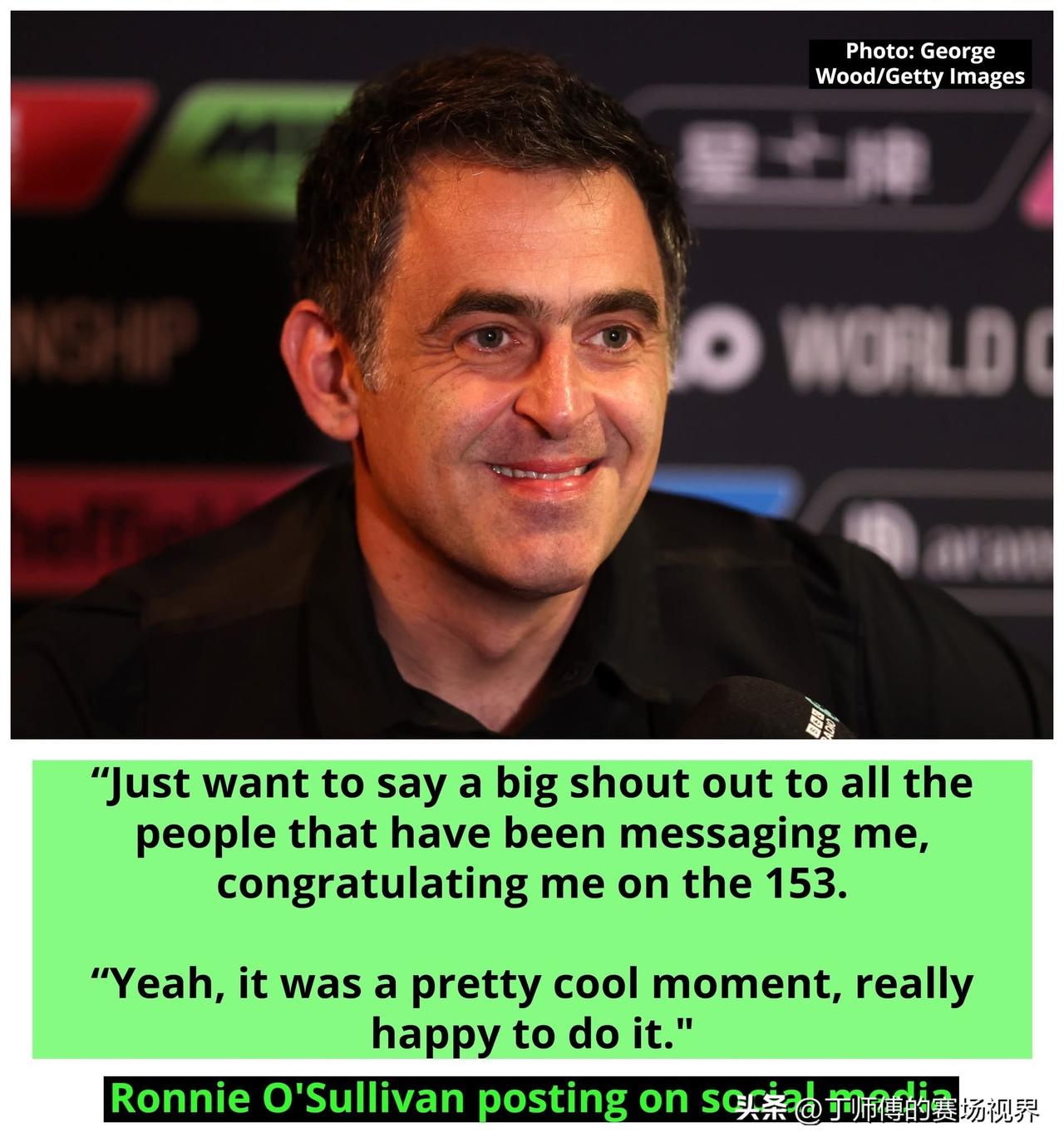 罗尼·奥沙利文在社交媒体上感谢粉丝们对他打出153分刷新斯诺克单杆最高世界纪录的祝贺。 奥沙利文说:“我要特别感谢所有给我发信息祝贺我打出153分的朋友们。毫无疑问,那一刻真的太棒了,我很高兴能做到。” 这位七届世界冠军承认,这感觉非常特别,他目前拥有用时最快的147、数量最多的147和单杆最高分的纪录,太不可思议了!