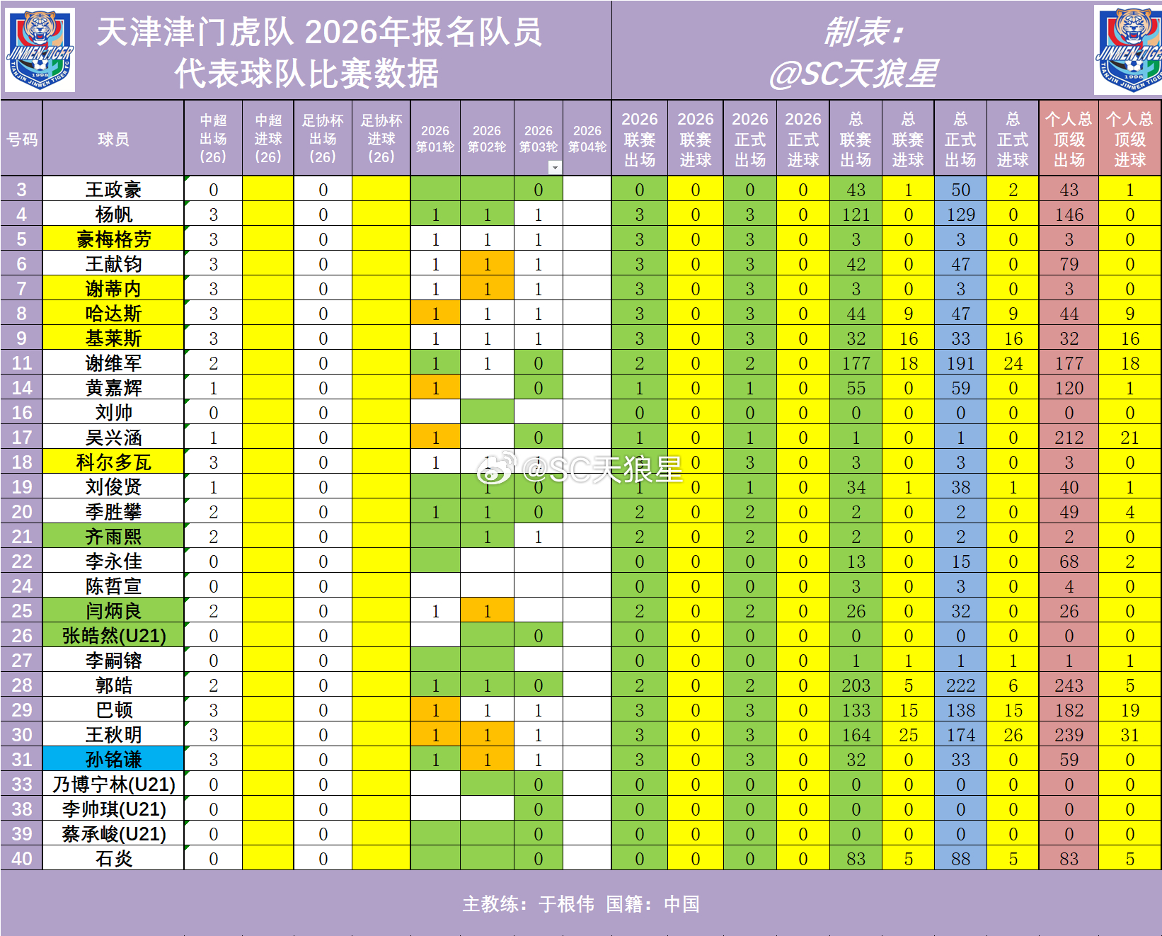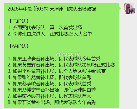 2026年中超 第03轮 天津津门虎队出场数据
