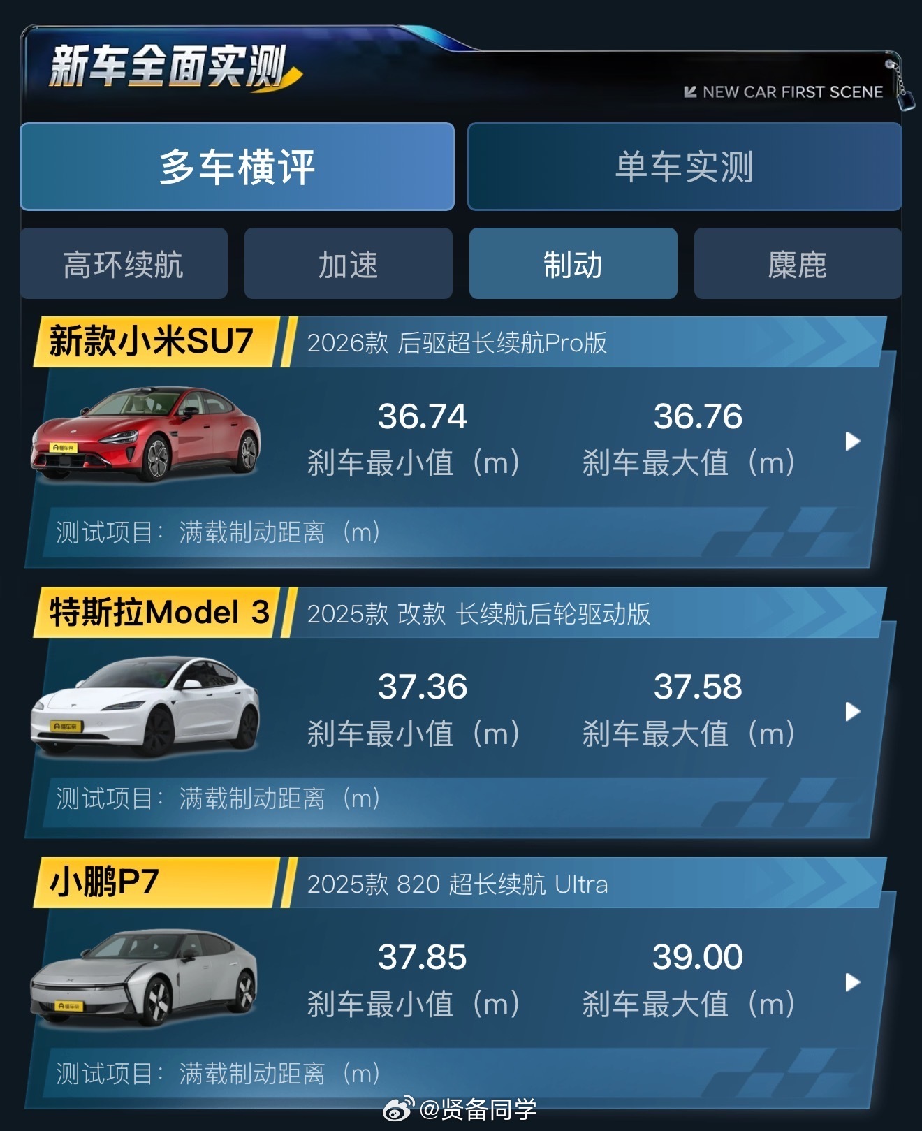 新一代SU7Pro懂车帝实测数据,零百加速没有特斯拉毛豆3快;满载刹停距离 (100-0km/h),比毛豆3更短。