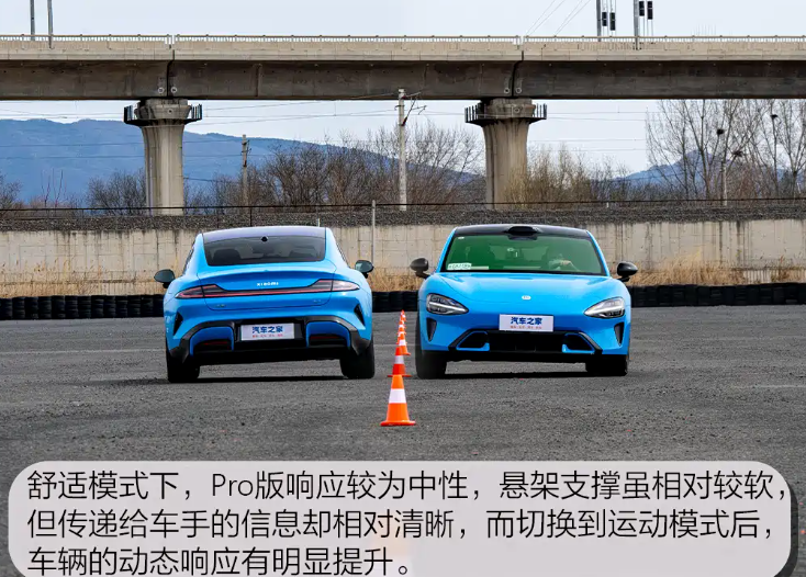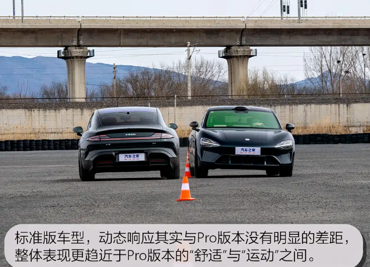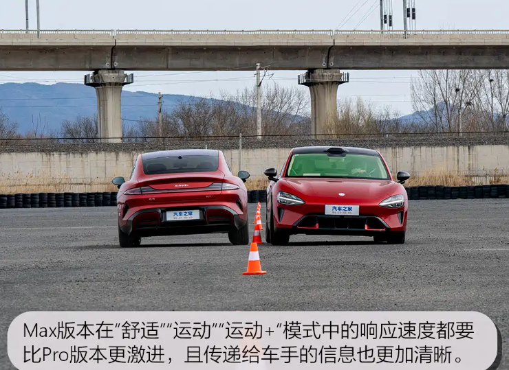最长续航892km,辅助驾驶硬件相同却表现不同小米SU7全系实测 性能测试 本次咱们测试的三款车型分别为小米SU7 2026款 标准版(靛石绿) 2026款 Pro(卡布里蓝)以及2026款 Max(赤霞红)。2026款小米SU7全系均配备V6S Plus电机,动力与上代车型相比均有小幅度提升,不过整备质量也有着不同程度的上浮。标准版、Pro版车型为单电机后轮驱动,Max版则为双电机四轮驱动。 26款Max加速成绩与此前我们测试的24款无明显差异。标准版和Pro版初段动力输出表现不错,起步时车轮出现轻微打滑现象,由于整备质量相差125kg,两车实际的加速成绩稍有差异,但在所有单电机纯电车型中都处于中上游水平,同时略好于我们上周测试的宝马330Li,完全可以满足日常家用。 绕桩测试中,我们首先驾驶配备空悬的Pro版车型,并且会以这辆车为标准,再延展到入门的标准版和Max版,看看这三款车在操控性能上的差距。 双腔空悬的支撑性也有着明显改善,但此模式下传递给车手的信息略显模糊,并且轮胎抓地力极限会更早突破,在反复多次重心转移时需更精细的控车手法,否则辅助系统会频繁介入。而在将双腔空悬调整至“运动+”模式后,车辆的动态性能提升并不像从“舒适”到“运动”的变化那么明显。 Max版虽然有了双电机四驱与抓地力更强的轮胎加持,但整备质量相比Pro版多出的100kg,在测试中还是有非常明显的体量感。抓地力更好、扁平比更低的轮胎在提升车头响应速度的同时,也让车尾动态更为灵活。但由于车重较高,在反复多次重心转移时,车辆会从中性的转向动作朝着转向不足的趋势变化。 标准版在没有双腔空悬的加持下,动态响应其实与Pro版本没有明显的差距,整体表现更趋近于Pro版本的“舒适”与“运动”之间,而整备质量比Pro版本轻了125kg后,理论上标准版车型应该有着更清晰、更丰富的动态表现,但实际上由于后悬架设定偏软,在反复多次测试后,开始出现轻微阻尼衰退,车尾动态略显迟缓,此时给到前轮的负担更大,需要更多的转向动作才能在测试中避免碰桩。