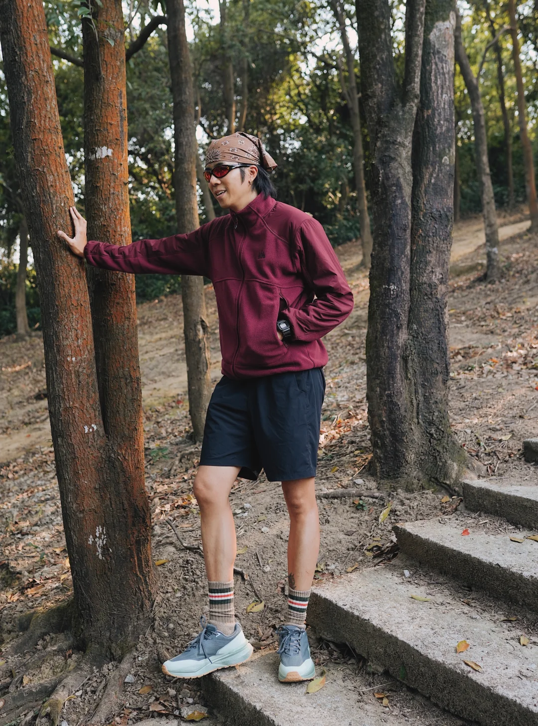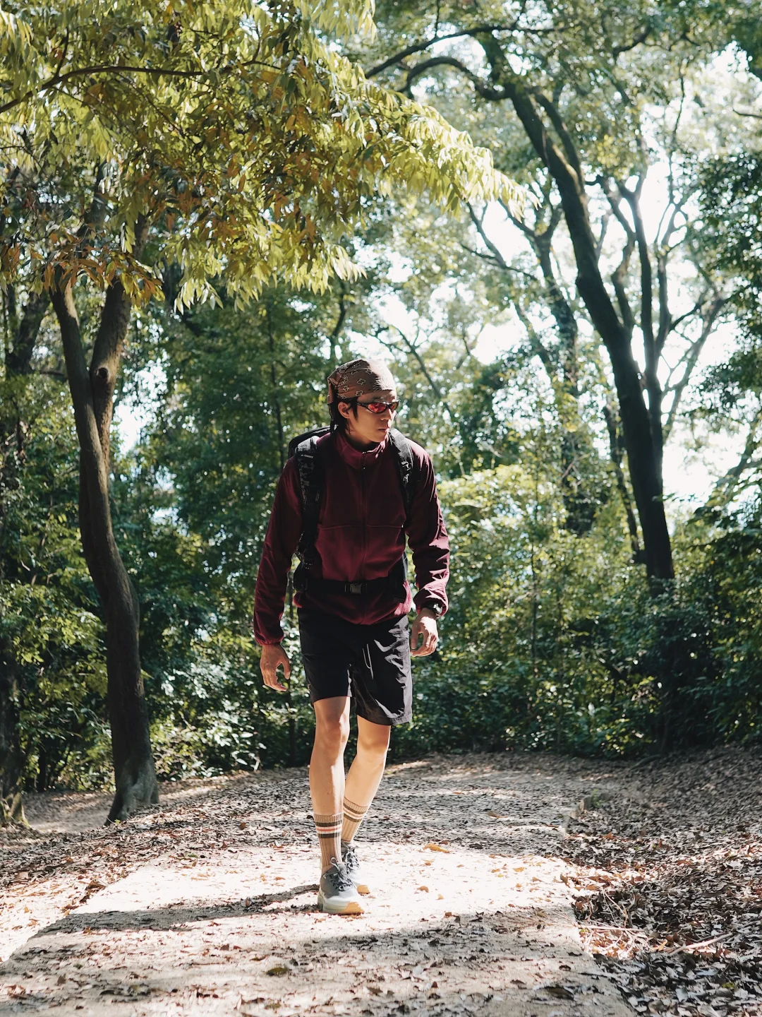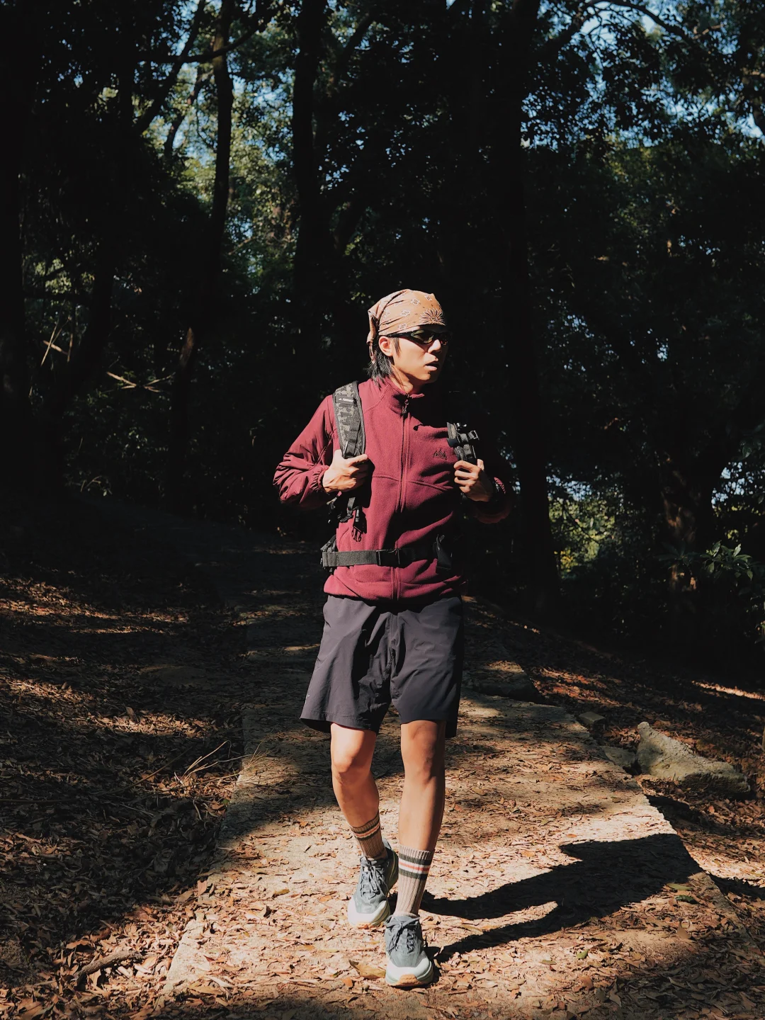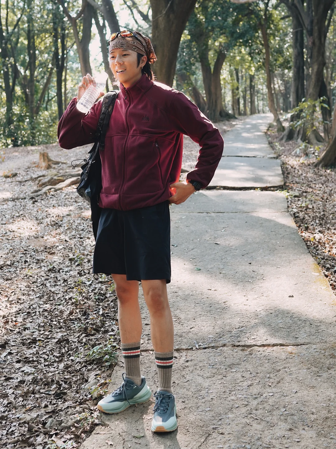 今天又来爬山啦⛰️ 这是我很喜欢的一条徒步线路 在黄埔的岭头大环线 其实在还没进入环线的山路上就已经很好看 在小溪边拍照也是非常帅的 进入岭头大环线后, 有一条是铺好的石板路照顾新手 也有“很野”的泥土路挑战😎 非常nice! 我今天穿的是361度的户外开襟卫衣和户外鞋 红色的上衣在户外就非常出片啦! 再加上头巾的点缀!户外松弛感拿捏! 搭配这双穿着舒适的户外鞋 暴走8km也不会累
