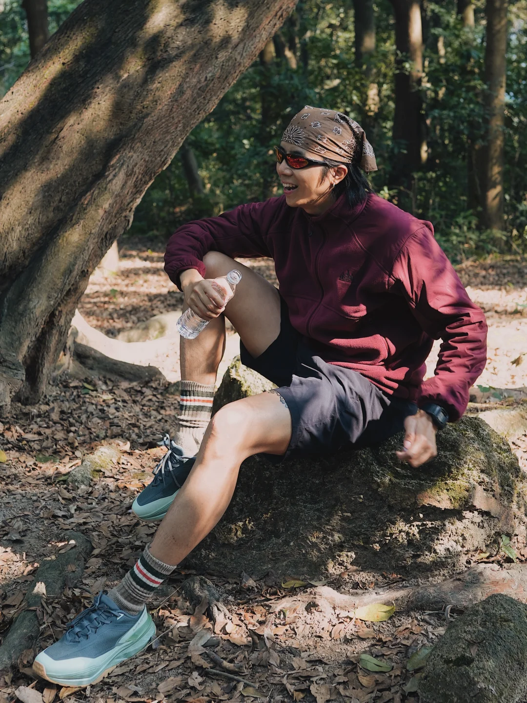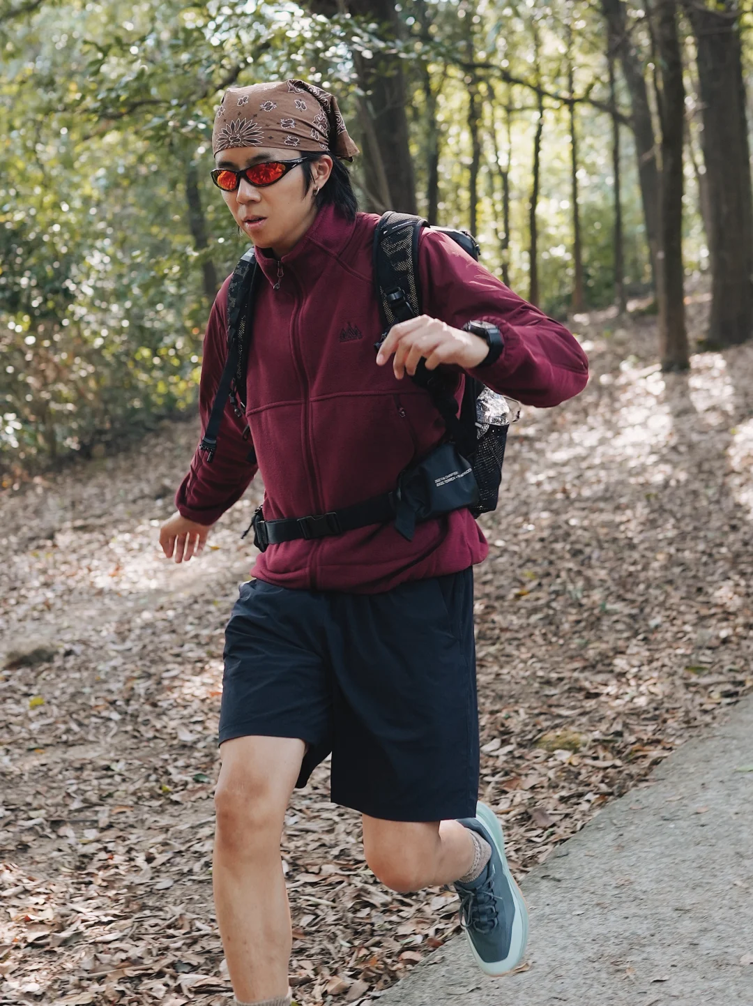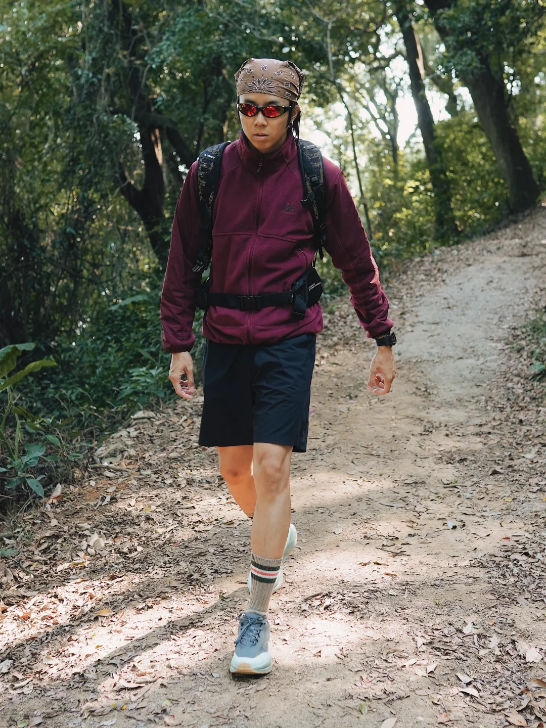 今天又来爬山啦⛰️ 这是我很喜欢的一条徒步线路 在黄埔的岭头大环线 其实在还没进入环线的山路上就已经很好看 在小溪边拍照也是非常帅的 进入岭头大环线后, 有一条是铺好的石板路照顾新手 也有“很野”的泥土路挑战😎 非常nice! 我今天穿的是361度的户外开襟卫衣和户外鞋 红色的上衣在户外就非常出片啦! 再加上头巾的点缀!户外松弛感拿捏! 搭配这双穿着舒适的户外鞋 暴走8km也不会累