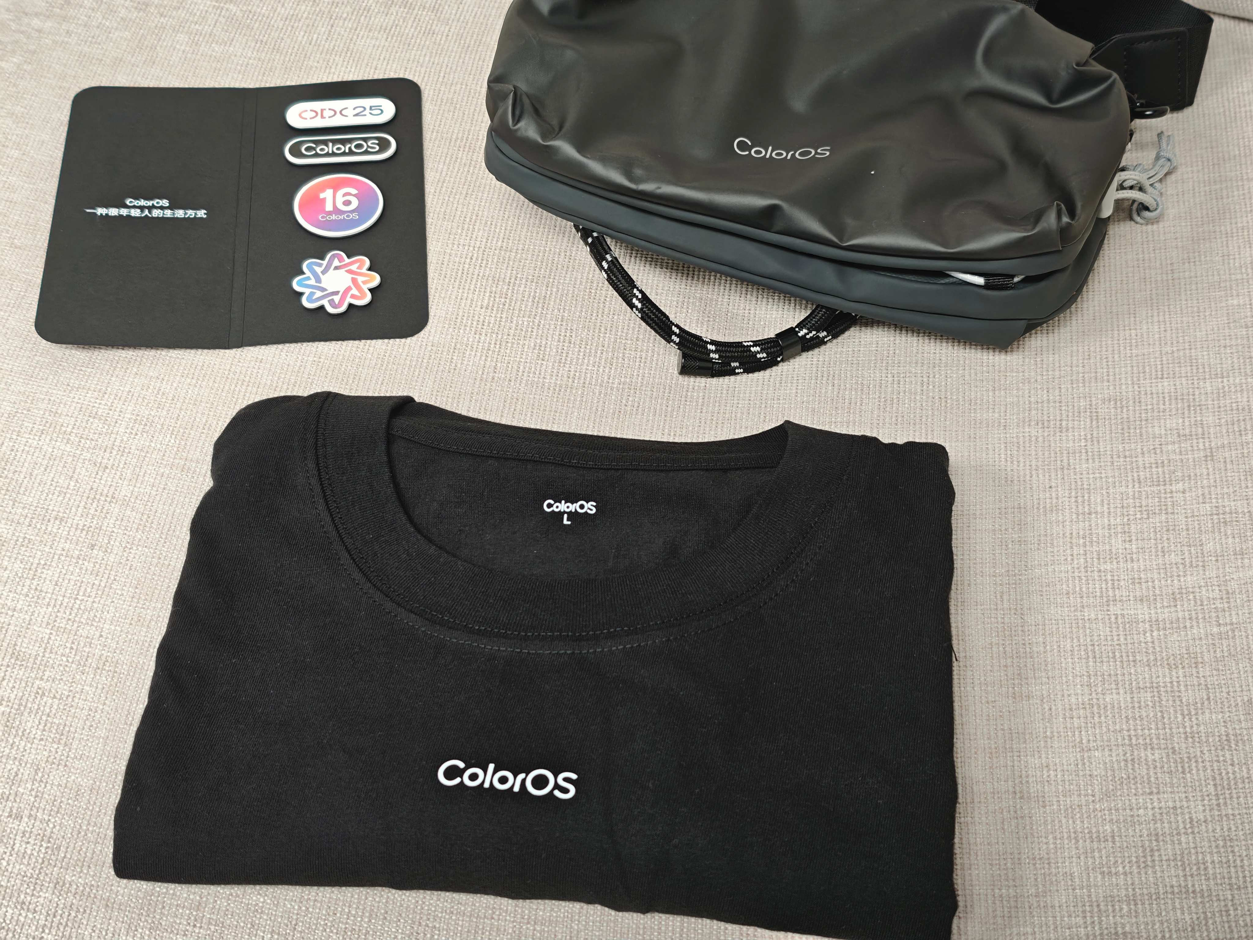 翻出了一套OPPO的伴手礼,里面是一套冰箱贴,一个单肩小包和一件T恤。