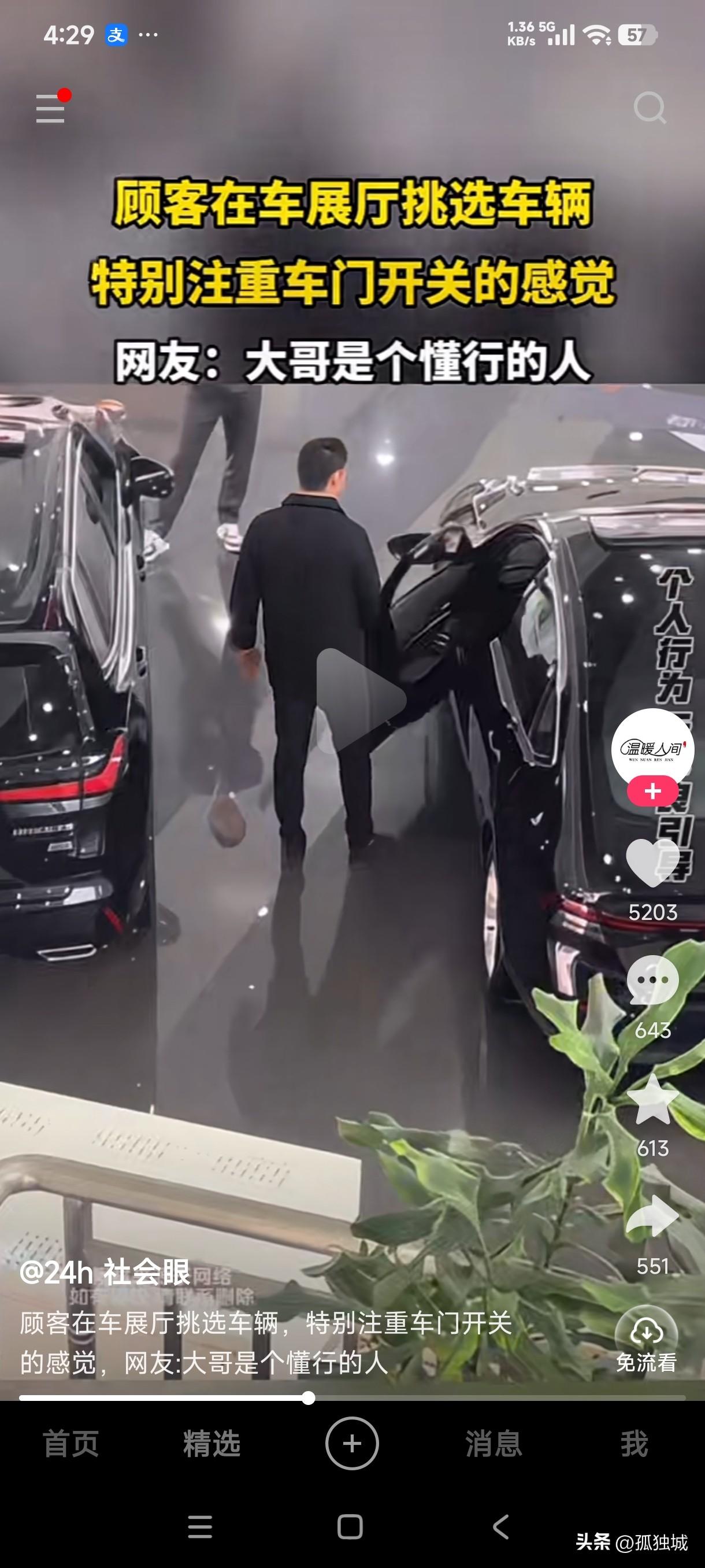 买车不是看配置吗? 这车主挑选车反复开关比对车门是什么意思?难道懂车的人买车只需要试一下车门就知道这车的配置高低了吗? 如此挑选车辆的操作真是让人看傻眼了,第一次看到挑选车辆专门比对车门的,这样挑选车的人还真没有见到过,有网友说如此挑选车的人才是真正懂车的人,一时之间真是搞不懂这样的操作,这样做的目的是为了听一下开关车门的声音?还是为了判断车门的重量?以此来判断车子本身的质量和重量吗? 哪位大佬说说这样挑选车辆的做法究竟是在判断什么?