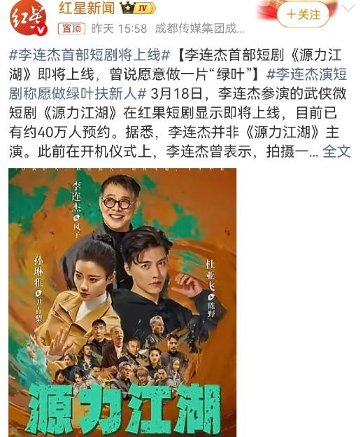 李连杰,正式官宣! 3月19日,功夫巨星李连杰,突然冲上热搜,就在前一天,他官宣了一个大好消息,他的首部微短剧《源力江湖》,在红果短剧即将上线,短短时间预约人数就突破40万,热度直接拉满。 李连杰官宣的消息,就是他的首部微短剧《源力江湖》,马上就要在红果短剧平台上线了。可能有些中老年人不知道什么是微短剧,其实就是时长很短的电视剧,每一集就几分钟,不用花太多时间,拿手机就能看,特别方便。 而这个红果短剧,是抖音旗下的一个免费APP,不用花钱充会员,只要看几分钟广告,就能免费看所有短剧,里面还有小说、听书,没事的时候刷一刷,很适合中老年人消遣。 本来大家看到李连杰出演微短剧,就已经很惊喜了,毕竟他已经淡出荧幕很多年,平时很少露面,这次突然官宣新作品,自然吸引了很多人的关注。更让人意外的是,这部短剧刚官宣要上线,短短时间里,预约观看的人数就突破了40万,热度直接拉满,足以看出大家对李连杰的喜爱,还有对这部微短剧的期待。 很多人一开始都以为,李连杰这次是主演,毕竟他是功夫巨星,不管拍什么作品,按理说都该是主角。但其实不是这样,李连杰这次是以“特别出演”的身份加盟的,他不是主角,而是甘愿做一片“绿叶”,专门扶持新人演员。 这部剧的主演是两个年轻人,男主杜亚飞是北京电影学院毕业的,有扎实的动作功底;女主孙琳雅更厉害,是武英级运动员,还拿过全国武术冠军赛的冠军,都是有真本事的年轻人。 李连杰今年已经62岁了,这些年他的身体状况一直被大家关心,之前还有很多谣言,说他换了心脏、换了血,身体特别不好。 其实这些都是假的,李连杰自己也多次辟谣,去年8月他做了颈部良性肿瘤切除手术,还幽默地说自己是“硬件返厂维修”,术后恢复得很好,第二天就忍不住去吃了刀削面。今年3月,他在台湾参加公益讲座时,还笑着说自己没病,也没换心脏,还调侃造谣的人想象力太局限。 可能有人会问,李连杰那么有钱,身家都超过20亿,根本不用靠拍微短剧赚钱,为什么还要花时间做这件事?其实他自己早就说了,他不是为了赚钱,而是有自己的责任。 他从小就跟着前辈学武术,现在有能力了,就想把武术精神传承下去,给那些有功夫、有梦想的年轻人一个机会。这次拍《源力江湖》,他不仅特别出演,还亲自指导新人演员的动作,坚持真打实干,不搞特效堆砌,就是想让大家看到真正的武术,让武侠文化能一直传下去。 这次官宣之后,网友们的讨论特别热烈,大家的看法也不一样。很多老粉丝特别激动,留言说“终于等到李连杰的新作品了,不管他演什么,都必须支持”“好久没看到真功夫的作品了,期待这部短剧”。 也有一些人觉得,李连杰作为国际功夫巨星,去拍微短剧有点“掉价”。但其实不是这样,微短剧只是一种新的影视形式,不是低端的代表,李连杰选择这种形式,就是因为它接地气、传播广,能让更多人看到武术的魅力,尤其是年轻人,能让他们喜欢上中国功夫。 还有很多人关心李连杰的身体,看到他近期的照片,觉得他比以前苍老了很多,脸上有坑洼,精气神也不如从前。其实这都是有原因的,他早年拍武打戏,留下了很多旧伤,后来又得了甲状腺功能亢进症,长期吃药导致面部有变化,加上去年的手术,才变成现在的样子。 不过知情人士说,李连杰现在生活很规律,晚上10点睡,凌晨4点起,每天坚持打太极、游泳,身体状态正在慢慢回升。 大家都知道,李连杰这一辈子,都在为武术传承努力。从19岁拍《少林寺》,让中国功夫走向世界,到后来淡出荧幕,做公益、推太极进校园,再到现在拍微短剧扶持新人,他一直都在践行自己的责任。这次《源力江湖》预约人数突破40万,也证明了大家对他的认可,对真功夫的期待,对武侠文化的热爱。 目前,这部微短剧还没正式上线,不过已经在红果短剧平台开启了预约,只要打开红果短剧APP,搜索《源力江湖》,点击预约,等上线了就会收到通知。很多中老年人也跟着预约了,都说想看看李连杰的表现,看看这些新人演员的真功夫。 其实不管这部短剧最终效果怎么样,李连杰的这份心意和责任,都值得我们敬佩。他不用靠作品捞金,也不用靠热度博眼球,只是想做自己想做的事,传承自己热爱的武术文化。 相信等到《源力江湖》上线的时候,一定会掀起一股武侠热潮,也希望李连杰能一直保持好的身体,以后能带给我们更多好看的作品,让中国功夫一直传承下去。