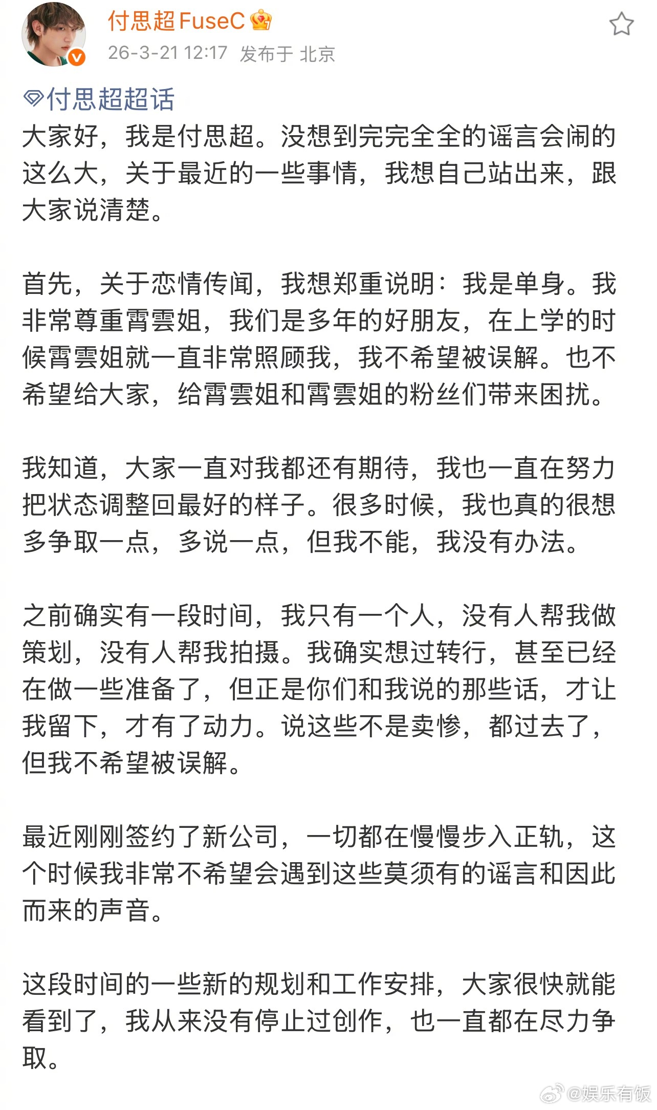 付思超否认与黄霄云恋情付思超说和黄霄云只是朋友 付思超发文回应恋情传闻,明确表示自己是单身,和黄霄云是多年的好朋友,上学时对方就很照顾自己,不希望被误解,也不想给彼此和粉丝带来困扰。同时他也提到刚签约新公司,一切步入正轨,未来会有新的工作规划和安排,也从未停止创作。付思超