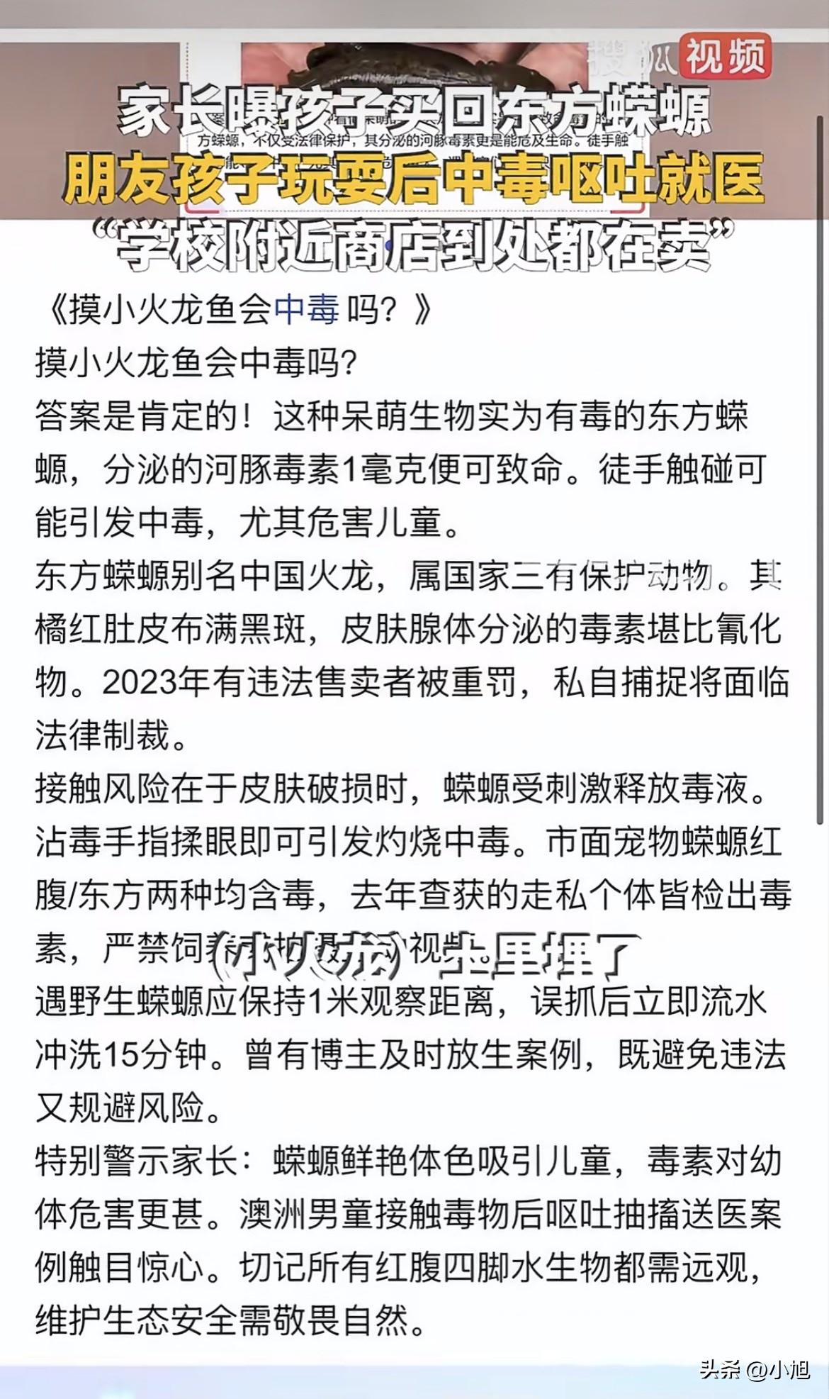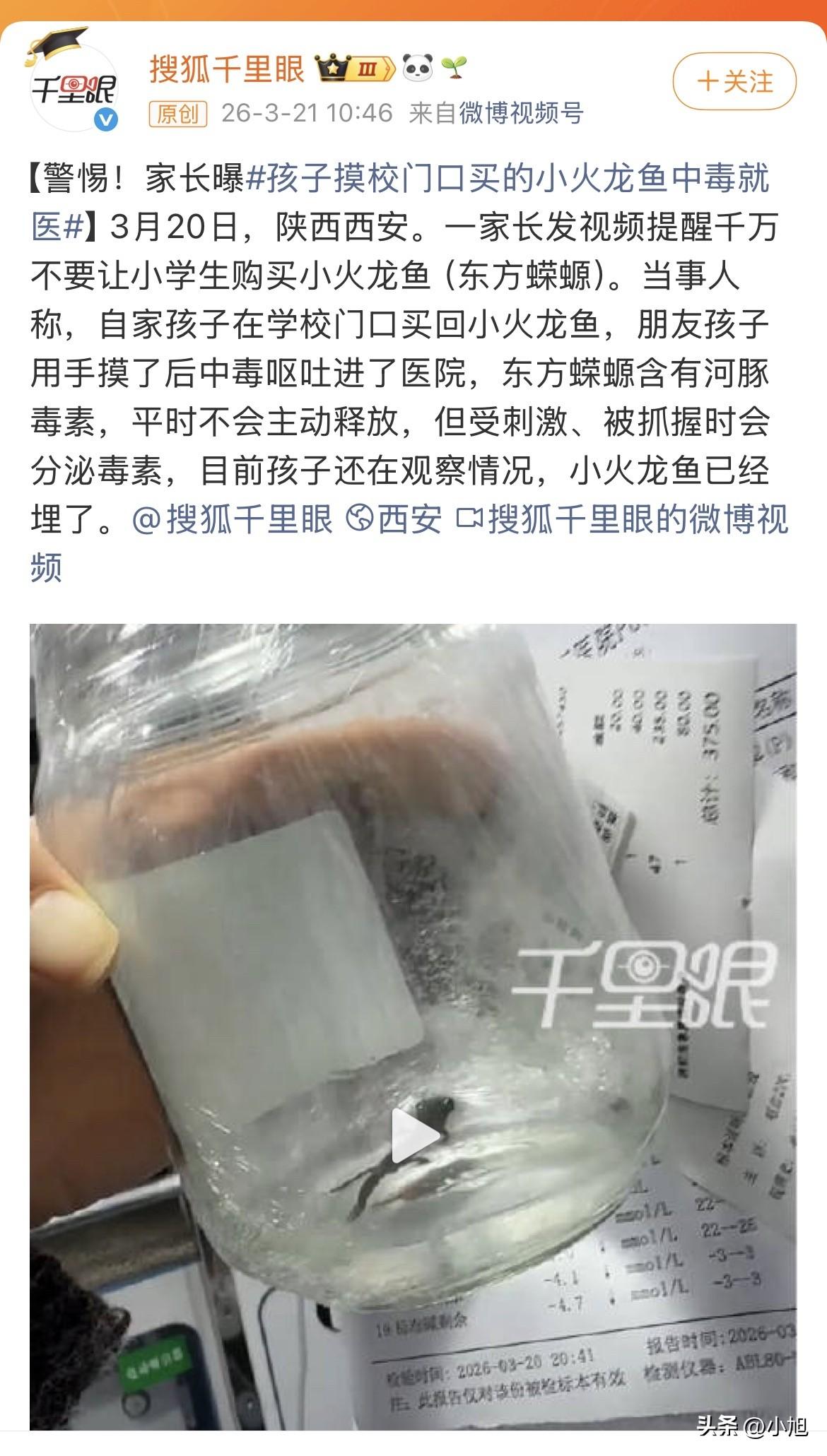 3月20号,西安一个妈妈发了条视频,语气听着还算平静,但说的内容让很多人后背发凉。 朋友家的孩子,在学校门口买了条“小火龙鱼”。就是那种花花绿绿、看着特别讨喜的小东西。孩子用手摸了,没过多久就开始呕吐,人直接进了医院。 医生说,没法确定是不是因为这鱼导致的。 孩子还在观察。 这条“小火龙”已经被家长埋了。 视频里妈妈说得挺简单的,但能感觉到她打字的时候手都在抖。一个活蹦乱跳的孩子,突然就吐得不行躺医院了,起因就是学校门口花几块钱买的“宠物”。 她发视频就一个目的:告诉别的家长,千万、千万、千万别让孩子碰这东西。 我查了下,这东西根本不是鱼,学名叫东方蝾螈。它身上带着河豚毒素,跟河豚身上那个毒是一类。1到2毫克就能要一个成年人的命。关键是没特效解毒药,医院只能催吐、洗胃,剩下的就看命。 但它有个特点,平时不主动放毒。只有当它受惊吓、被人抓握的时候,皮肤才会往外分泌毒素。 这话换个角度理解就是——孩子花几块钱把它买回来,觉得好玩,拿在手里摸。在它眼里,这就是要被弄死的节奏。它拼了命放毒保护自己。结果孩子中毒了,它自己也被埋土里了。 从野外被抓到的那一刻起,它就注定是死路一条。只不过这一次,它顺便把孩子也带进了医院。 家长在视频里说已经把蝾螈埋了。这句话听着简单,其实信息量挺大的。 她没说“扔了”,说的是“埋了”。这说明在她心里,这东西虽然害了孩子,但它也是个活物,不能随手扔垃圾桶。做家长的,在孩子躺医院的时候,还能想着给这东西一个体面的处理方式,这人心地是善良的。 但善良归善良,这件事的荒诞感就在这儿——孩子花零花钱买了条命,差点把自己的命搭进去,最后这条命也被孩子妈亲手埋了。 谁赚了?谁亏了?没人说得清。 我翻了翻这事儿的来龙去脉,发现一个细节特别值得琢磨。 这蝾螈,是孩子在学校门口买的。学校门口是什么地方?那是家长默认安全的地方。孩子放学了,兜里有点零花钱,在校门口买点零食、买点小玩具,家长通常不会多想。 但现在,一个有毒的活体动物,就这么堂而皇之地摆在学校门口卖。几块钱一条,小学生零花钱刚好够。 谁能想到呢?一个活生生的东西,看着那么好看,孩子伸手就能摸,摸完就进医院了。 这事儿最让人想不通的是,它不是第一次发生。2016年镇江就有过,摊贩当“娃娃鱼”卖给学生,五块钱一条。2017年浙江也有过。现在都2026年了,同样的东西,同样的卖法,同样的孩子进医院。 这说明什么?说明有些东西,十几年了,从来没人管过。 或者说,管过,但没管住。 我注意到一个细节,医生当时说“没法确定是不是因为这鱼导致的”。这句话细想很要命。一个有毒的东西,连医生都不熟悉,没办法第一时间判断病因。 那家长就更不知道了。孩子在学校门口买回来的时候,家长可能还在想,这玩意儿真好看,孩子真会玩。谁能想到好看的东西要命呢? 其实仔细想想,蝾螈能一直出现在学校门口,根本原因不是监管不力,而是它长得好看。 长得好看,孩子就想要。孩子想要,就有市场。有市场,就有人敢卖。至于它有没有毒,卖的人不管,买的人不懂,用的人不知道。 这就是这件事最荒诞的地方——一条命,因为长得好看,被当成玩具卖。孩子因为好奇,差点丢了命。最后埋它的,是被它害了孩子的那个妈妈。 你说这事怪谁?怪孩子?孩子才多大,哪懂什么河豚毒素。怪家长?家长哪能想到学校门口卖的东西会要命。怪摊贩?摊贩可能自己都不知道这玩意儿有毒,就知道好卖。怪监管部门?学校门口流动摊贩那么多,今天在这明天在那,怎么管? 每个人好像都有理由,但每个人都脱不了干系。 家长在视频最后说,已经把蝾螈埋了。 这句话让我想了很久。她埋掉的不仅是一条蝾螈,还有孩子的好奇心,还有她对学校门口的信任,还有那种“孩子放学买点小玩意儿没事”的安全感。 都埋了。 下次孩子再在学校门口看到好看的玩意儿,伸手要钱买的时候,这妈妈会怎么做?是拒绝,还是跟着去,还是先上网查查有没有毒? 一个几块钱的小东西,硬生生把一个家庭的日常节奏打乱了,把家长对学校门口的那种天然信任撕碎了。 你觉得,这事儿到底该谁来负责?